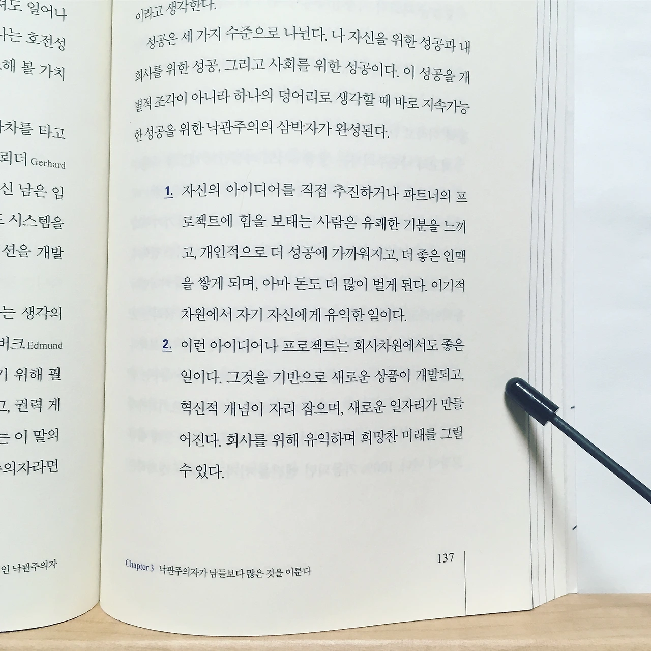 성공은 세 가지 수준으로 나뉜다. 나 자신을 위한 성공과 회사를 위한 성공, 그리고 사회를 위한 성공이다. 이 성공을 개별적 조각이 아니라 하나의 덩어리로 생각할 때 바로 지속 가능한 성공을 위한 낙관주의의 삼박자가 완성된다. (137)