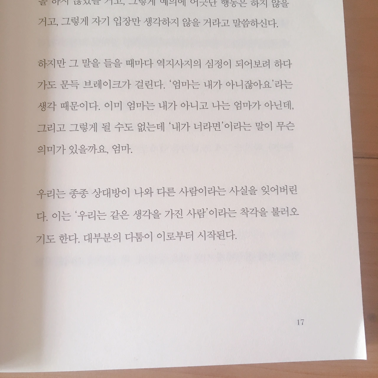 우리는 종종 상대방이 나와 다른 사람이라는 사실을 잊어버린다. 이는 ‘우리는 같은 생각을 가진 사람’이라는 착각을 불러오기도 한다. 대부분의 다툼이 이로부터 시작된다. (17)