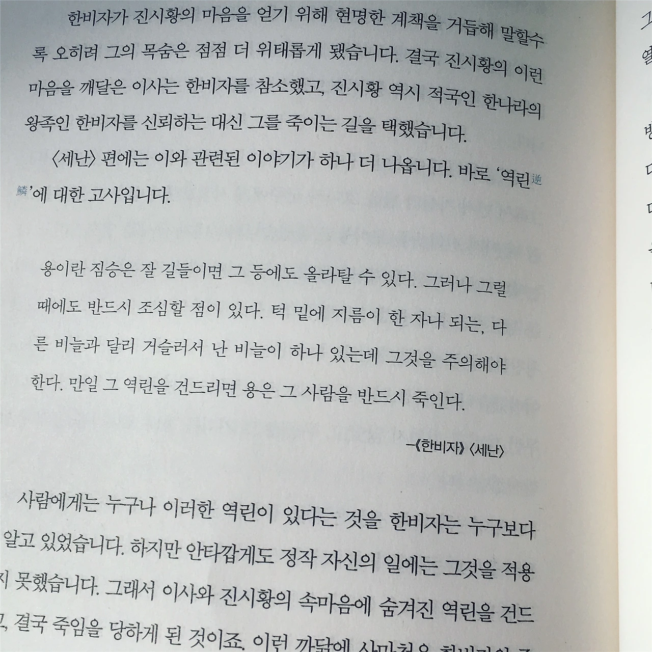 용이란 짐승은 잘 길들이면 그 등에도 올라탈 수 있다. 그러나 그럴 때에도 반드시 조심할 점이 있다. 턱 밑에 지름이 한 자나 되는, 다른 비늘과 달리 거슬러서 난 비늘이 하나 있는데 그것을 주의해야 한다. 만일 그 역린을 건드리면 용은 그 사람을 반드시 죽인다. -<한비자>, (세난) (226)