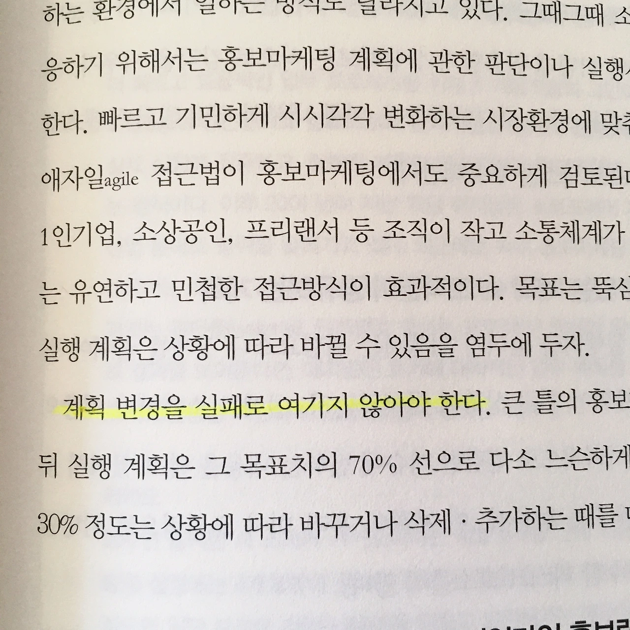 개인적으로 7장, ‘위기 때 더 빛을 발하는 홍보’ 부분이 의미 있게 느껴졌다. 홍보마케팅은 ‘내가 가진 무기를 효과적으로 돋보이게 만드는 방법’이라고 생각했지 ‘위기관리’까지 준비하고 있어야 한다는 생각은 해 본 적이 없다. 코로나19 같은 위기 상황을 준비해온 회사나 사람도 드물겠지만, 시련은 언제든 누구에게나 나타날 수 있다. 위기를 극복하기 위한 매뉴얼을 만들고 관리해야 한다는 새로운 가르침을 얻은 것이 참 좋았다.
