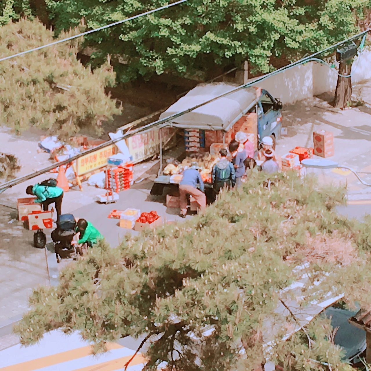 벌써 6월이다. 눈 깜짝할 사이에 겨울에서 봄을 지나 여름이 왔다. 올해는 유난히도 빠르게 흘러가는 시간이 야속하다. 늦은 아침밥을 챙겨 먹고 나니 벌써 10시다. ‘아, 벌써 열 시? 오늘도 과일 아저씨가 오셨나?’ 설거지를 하다가 창문 밖을 내다봤다. 역시 오늘도 변함없이 익숙한 트럭 주위에 몇몇 사람들이 모여 있다. 옆집 아저씨도 있고 늘 보던 할머니 할아버지도 계신다. 오늘도 네다섯 명 정도가 트럭 둘레에 모여 과일을 고르고 있다.