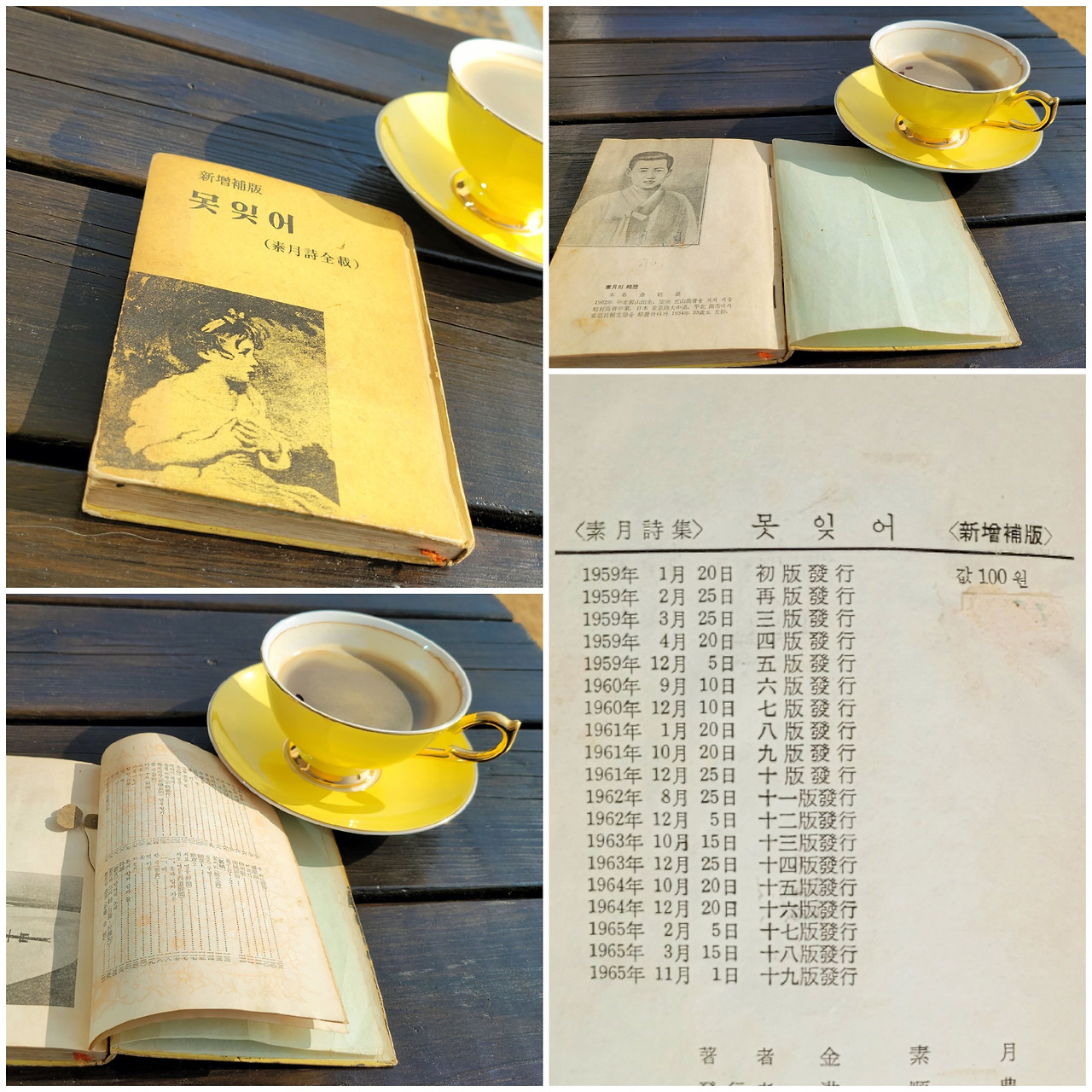 값 100원. 지난 성탄절에 받은 선물의 가격이다. 호호할배의 기다란 양말도 호호할매의 리본 상자도 없었다. 조심조심 양손으로 받아 들었다. 꽃촛불 켜든 성탄카드를 우체통에서 꺼낸 기분이었다. 소월 시집 <못잊어>. 노랑이었을 표지 양면은 누렇게 바랬고, 책등은 황토색을 건너 흙토색이다. 1959년 초판부터 1965년 19판까지의 상세 발행일자가 마지막 속지에 선명하다. 끝이 풀린 오렌지색 가름끈은 손때와 먼지의 세월로 거무스름해졌다. 읽다가 깜빡 잠들었을 때 머리맡의 자리끼가 저지리를 한 걸까. 뒤표지에 일렁인 물기가 파도무늬를 그려두었다.