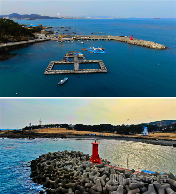 가두리유료낚시터가 들어선 울주군 서생면 송정항(사진 위)과 간절곶등대와 마주한 대송항의 전경.