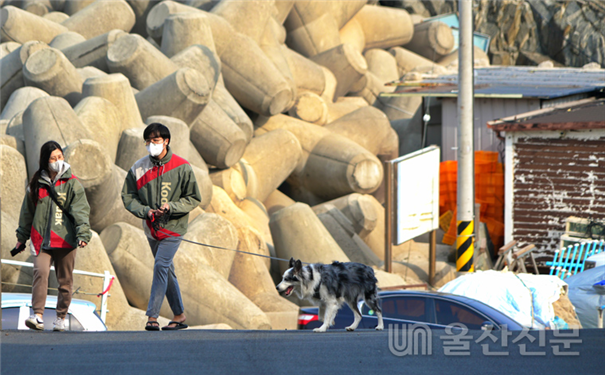산더미처럼 쌓인 송정항의 테트라포드 옆으로 애견과 산책을 즐기는 시민.