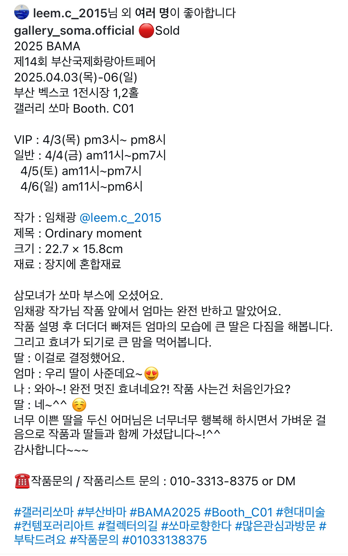 집에 와서 인스타그램에서 ‘갤러리 쏘마’를 찾아봤다. 대표님 인스타그램에 우리 사연이 담겨있었다.