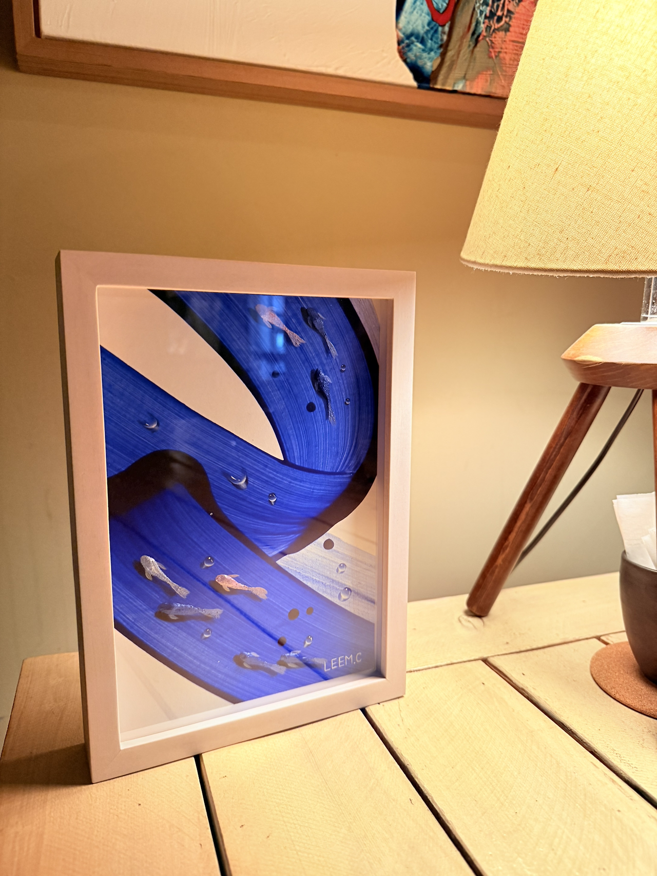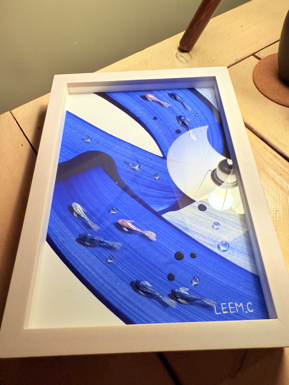 자연을 좋아한다. 그중에서도 냇가의 물고기를 좋아하는 편이다. 여름에 강변에 걷기 운동을 가는 건, 그 물고기들을 만나러 가는 길이기도 하다. 주말 딸과 화랑전시회에 갔다가 마주한 작품을 보고는 반해버렸다. 작품 설명을 들었는데, 세상에 기억나지 않는다. 분명 의미가 너무 좋았는데 말이다.