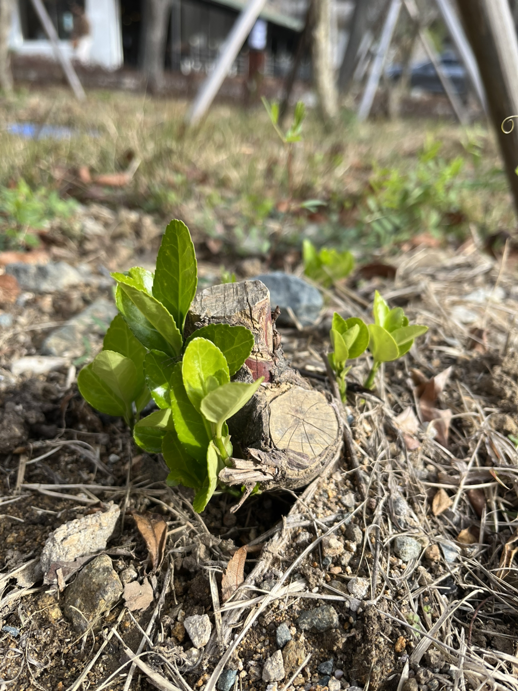 쪼그리고 앉아서 자세히 보니 베어버린 나무 둥지 옆에서 새싹이 자라고 있다. 사철나무다.
