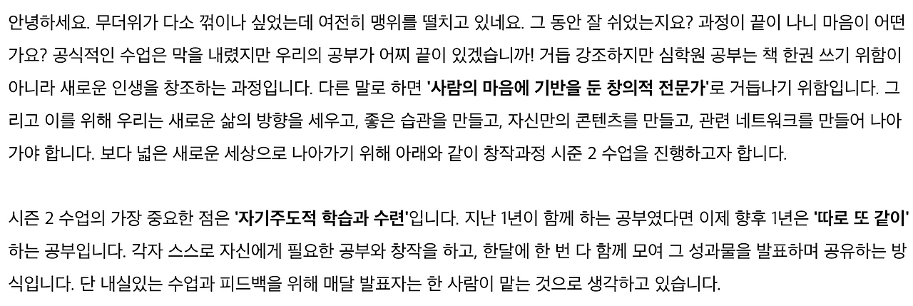 심학원은 그래서 좋았다. 고민 중인 것들을 학우님들과 나눌 수 있었기 때문이다. 매달 발표하면서 ‘나’라는 사람을 온전히 드러내고 안전하게 보여줄 수 있었다. 우리 안의 관계에서도 역동이 있었다. 투사하기도 하고 상처받기도 했지만, 신기하게도 다 풀어냈다. 매달 진하게 만났으니 자주 연락을 하지 않아도 심리적으로 연결된 느낌이 든다. 지금도 그렇다.