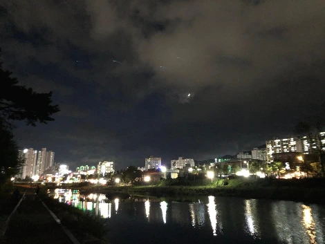 하늘에 달이 보였다. '내가 이 길에서 이렇게 선명하게 달을 본 적 있었나?' 이 마을에서 살게 된 건 7년 차이고, 이 길을 걸은 건 2년 다되어간다. 눈 앞에 초승달은 사진 속 달보다 더 선명했다. 사진에 담고 싶었지만 풍경보다 달이 선명하게 나오지 않았다. 가로등이 고장 난 덕분에 물 위에 비친 우리 마을 풍경과 어우러진 달을 만나게 되었다. 걸음을 멈추었다. 달을 보고, 머리 위의 하늘도 올려다보았다. 별이 보일 것 같았다. 처음에는 한 두 개 보였다. 몇 분동 안 보고 있으니, 수많은 별들이 점점 더 눈에 들어오기 시작했다. 가로등이 밝았을 때도 이 달과 별들은 있었을 거다. 고장 나서 어두워지니, 내 눈에 보이기 시작했다.