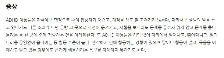 백과사전에 ADHD의 증상을 검색하면 매우 산만하고, 집중을 잘하지 못하며 시끄러운 이미지이다.