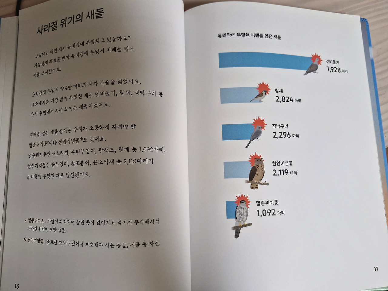 <유리창에 부딪치는 새들> (글 그림 소소한 소통, 엮음 국립생태원.)에 따르면 1년에 약 800만 마리의 새가 유리창에 부딪쳐 목숨을 잃는다고 한다. 760만 마리는 건물의 유리창에 부딪치고 약 23만 마리가 고속도로의 투명한 방음벽에 부딪쳐 피해를 본다고 하는데 이것은 조사된 숫자이고 그 외에 얼마나 더 많은 새가 이에 따라 목숨을 잃고 사라져 가고 있는지 모른다고 한다.