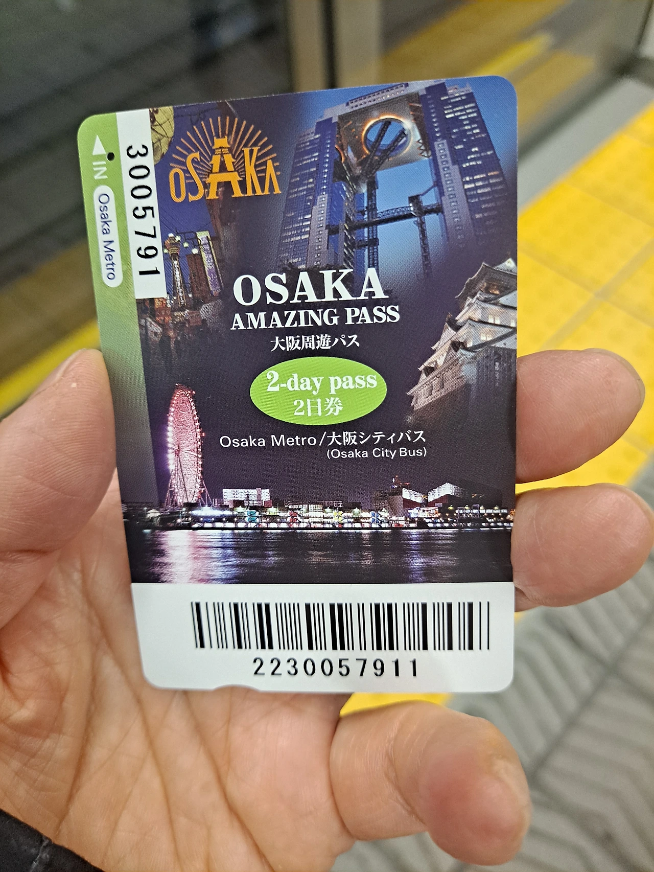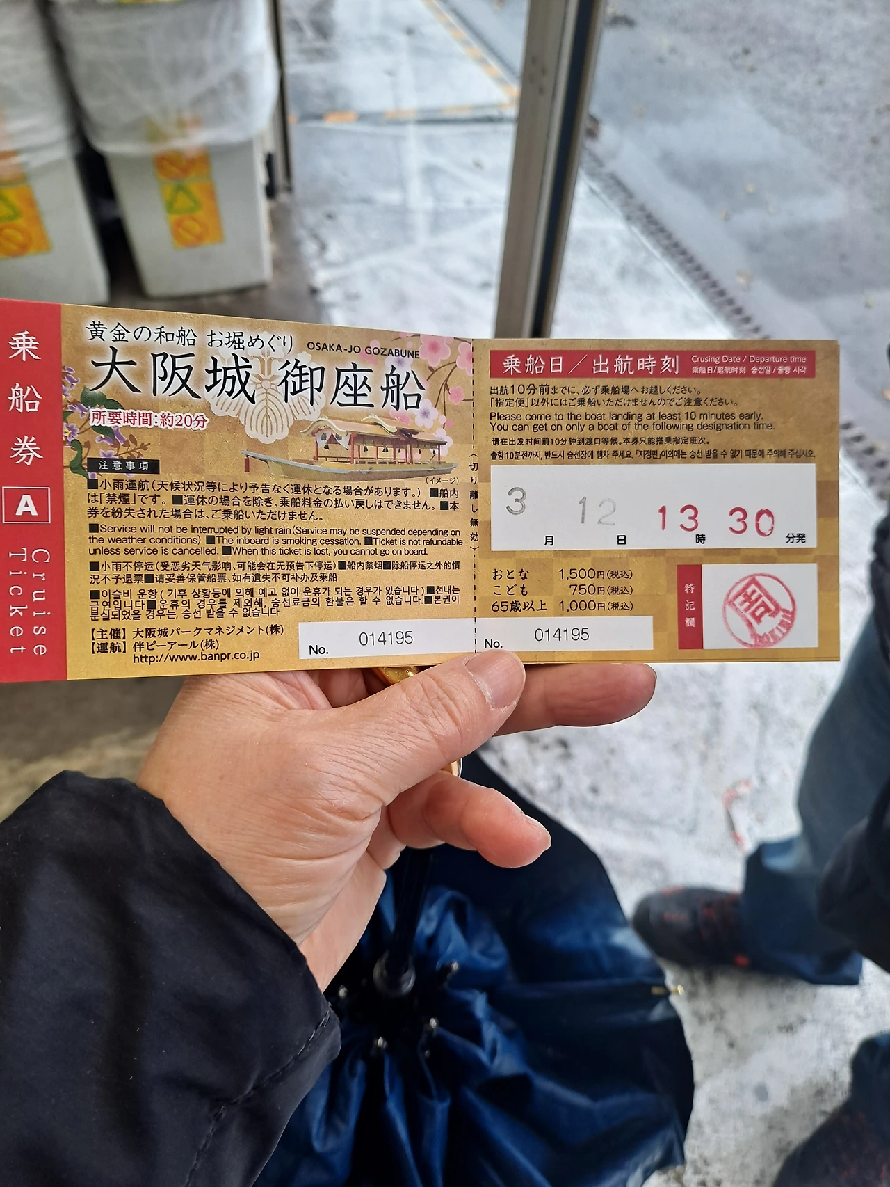 주유 패스를 이용해서 히고바시 역에서 전철을 탔다. 주유 패스를 개찰구에 넣자, 구멍이 뚫리고 날짜가 찍혀서 다시 나왔다. 예전 기차표를 철도원 아저씨가 펀치로 구멍을 뚫어 주던 때가 생각났다. 일본은 한국의 과거와 현재를 혼합한 느낌이었다. 혼마치 역에서 내려서 걸어갔다. 오사카성이 눈앞에 보였지만 꽤 오래 걸었다. 비가 많이 와서 작은 우산에 옷과 신발은 푹 젖어버렸다. 걸을 때마다 절걱절걱 소리가 났다.