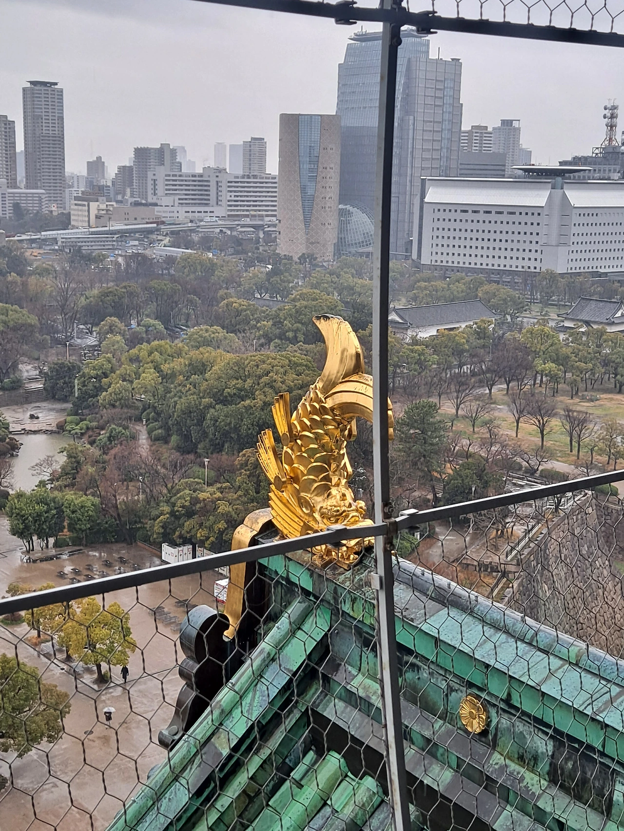 물새 떼와 해자. 높이 올려다보이는 천수각이 장관이었다. 처마 끝에 매달린 황금물고기도 비 온 뒤 햇살을 받아 반짝이고 있었다.