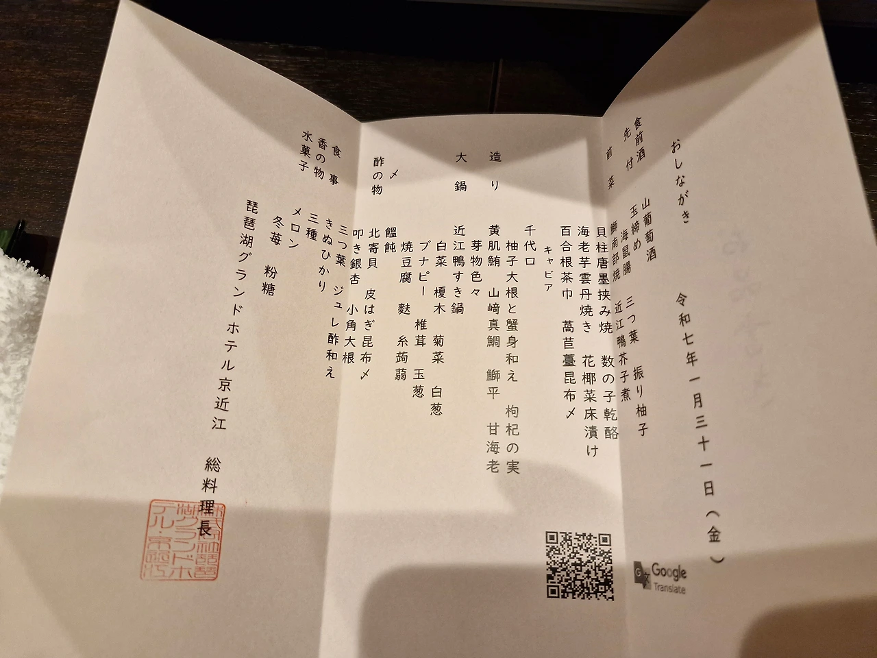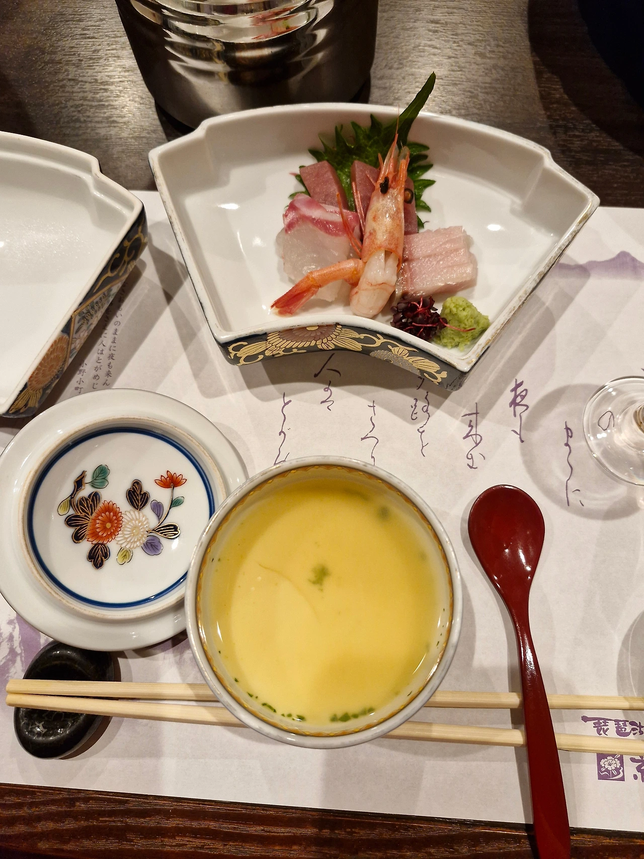 샴페인 잔엔 북방조개 무침, 작은 유리잔엔 웰컴 주가 있었다. 그날의 메뉴가 편지처럼 적어져 나왔다. 일본어로 씌어있어 잘 모르겠지만 코스요리 순서인 것 같았다. 자완무시와 모둠회가 각자 앞에 놓였다.