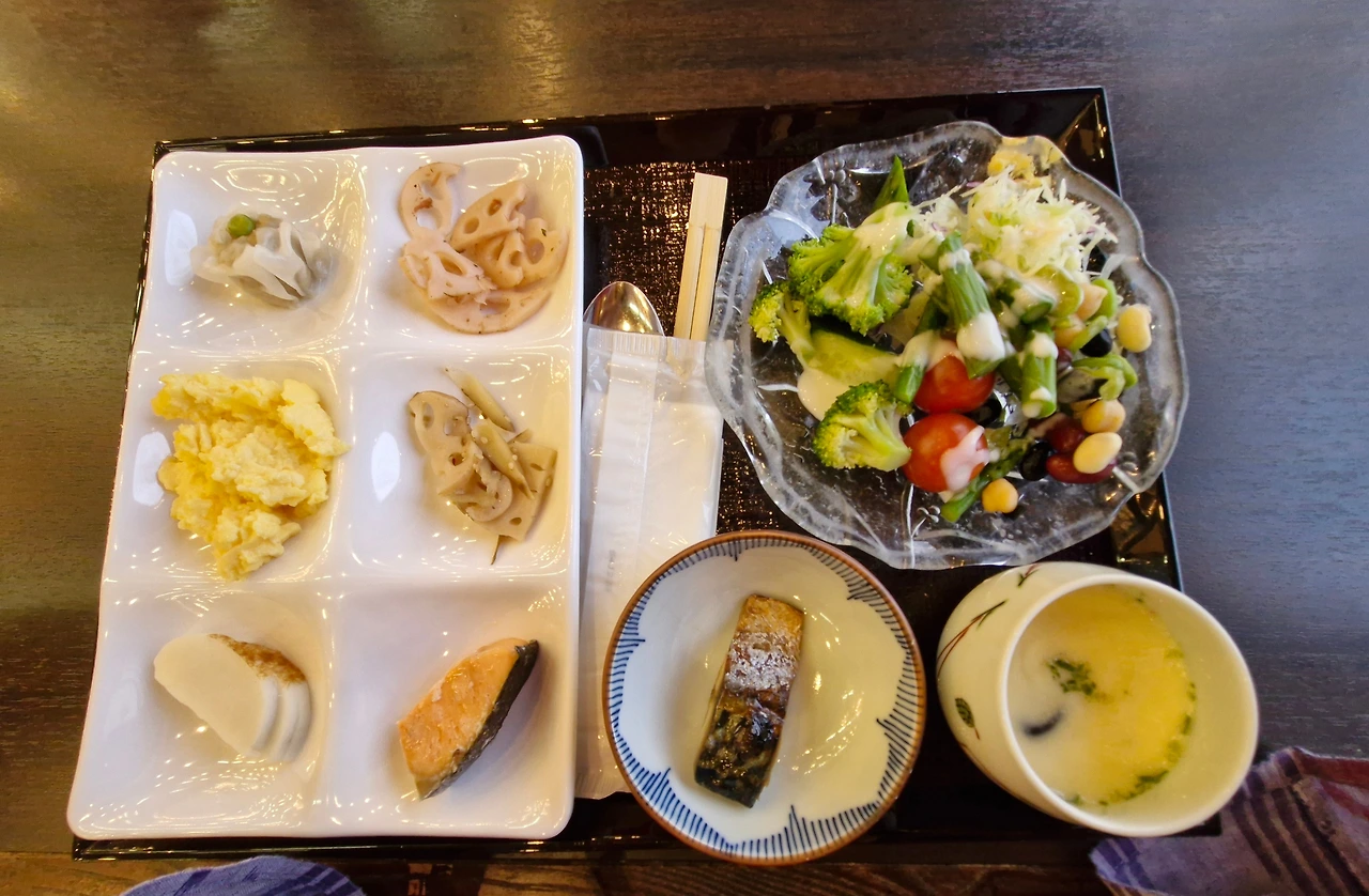 아침 조식을 먹으러 일 층으로 갔다. 조식을 주는 장소는 연회장이었는데 굉장히 넓었고 자리도 많았다. 뷔페였다. 직원들이 생선, 프렌치토스트같이 즉석에서 준비해 주는 코너도 있었다. 음식도 여러 가지 있었는데 샐러드용 야채, 여러 가지 빵, 반숙 계란, 카레, 100% 과일주스, 계란찜, 수프, 반찬도 여러 가지 있었다. 밥이 나오는 기계가 있어 신기했다. 밑에 그릇을 놓고 대, 중, 소 중 하나를 누르면 밥이 툭 떨어져 나왔다. 그릇들도 고급 도자기 그릇들로 구성되어 있었다. 유리로 된 볼에 샐러드 야채를 담아와서 먹었다. 여섯 칸으로 된 그릇이 있어 연근조림 야채 조림 등 여러 가지 반찬을 담았다. 세세하게 신경 쓴 모습이 보여 일본 사람의 친절함이 돋보였다. 11시 퇴실이라 느긋하게 아침을 먹고 짐을 싸서 다음 숙소로 이동했다.