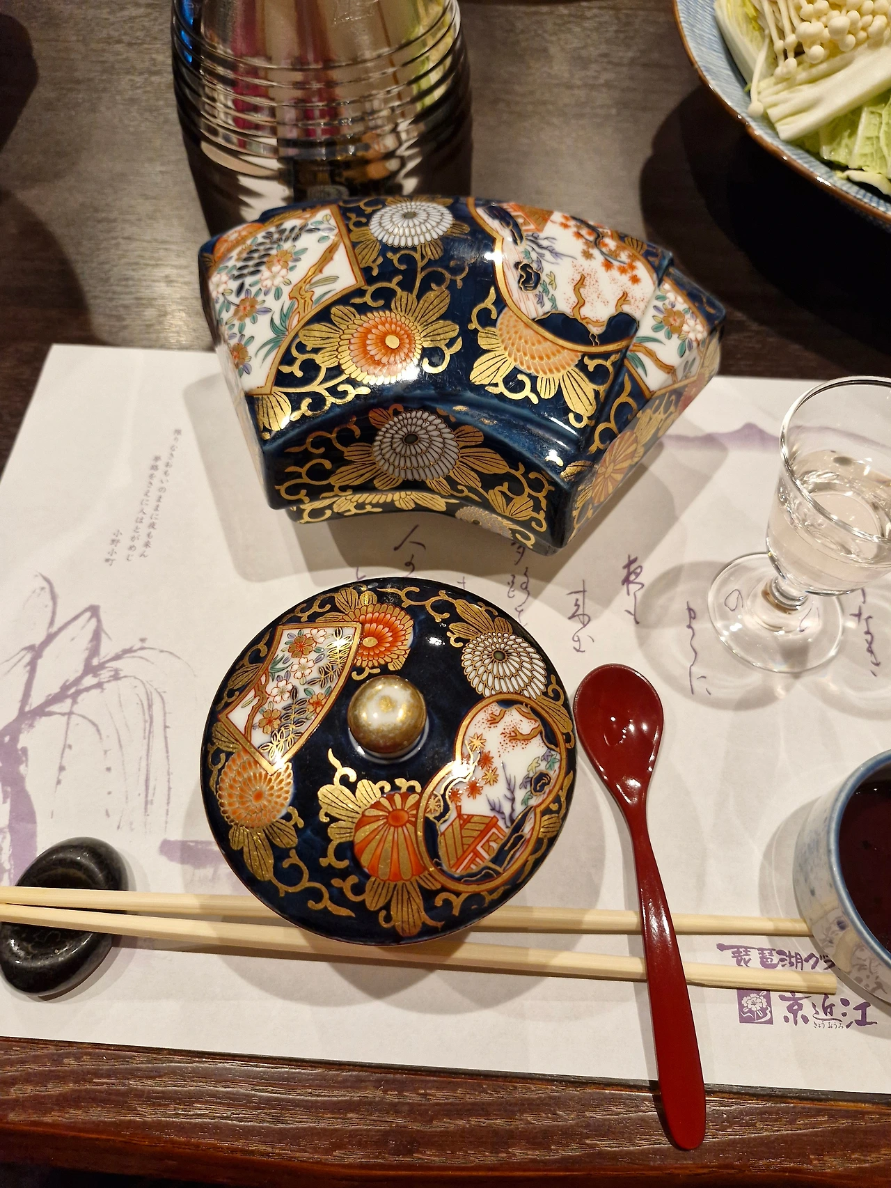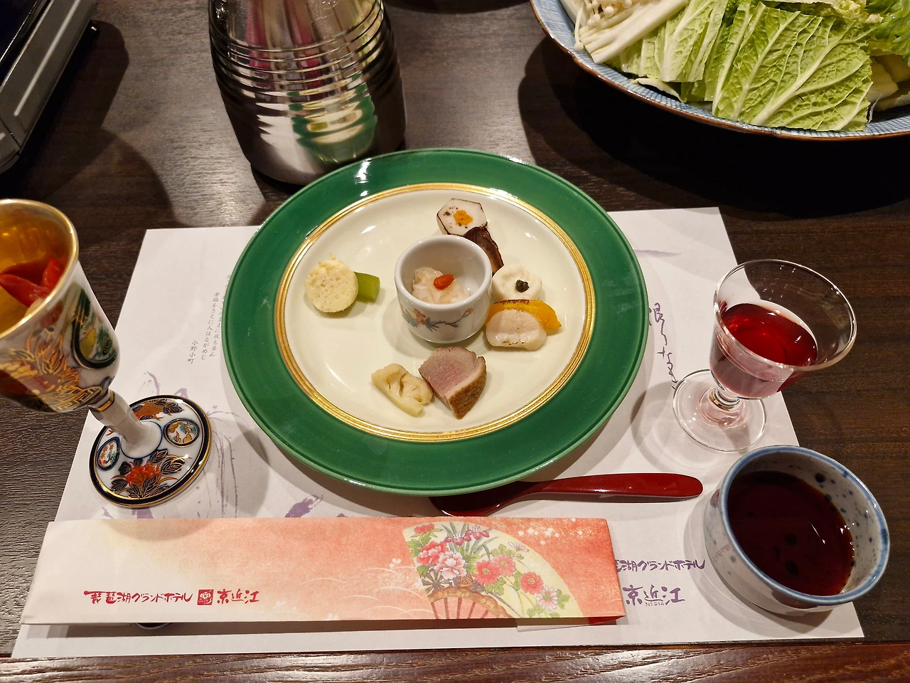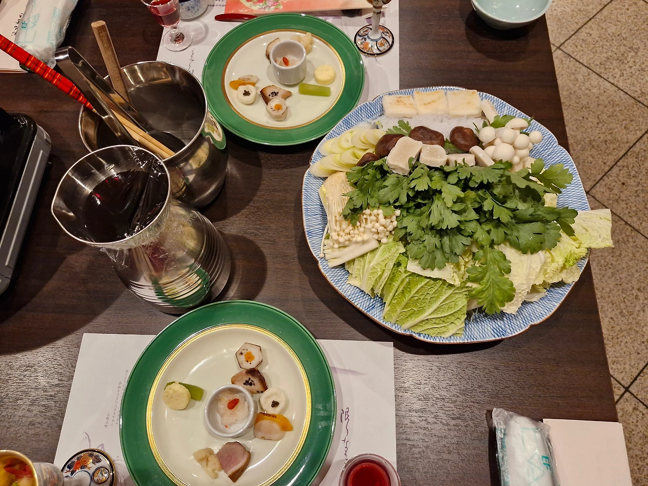 저녁 시간이 돼서 다시 2층으로 내려갔다. 문 앞에서 기다리니 직원이 와서 예약확인을 하고 안내해 주었다. 방에 커다란 도자기형 뚝배기가 가스버너에 올려져 있고 야채 한 접시, 애피타이저 접시에 치즈, 구운 오리고기, 구운 무와 구운 생선, 찐 콜리플라워, 야채 절임이 있었다.