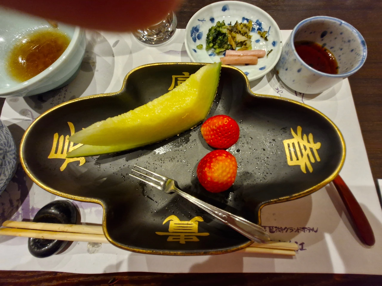 잠시 후 커다란 접시에 회처럼 얇게 썬 샤부샤부용 오리고기가 나왔다. 우리는 가락국수 사리도 시켰는데 오리고기가 많이 나올 줄 몰라서 당황했다. 다 먹을 수 있을까? 걱정과 달리 너무 맛있어서 다 먹고 밥이 나와서 밥도 먹었다. 고시히카리 쌀로 만든 밥이라서인지 달큼하고 고소하고 윤기가 반질반질 흘렀다. 배가 불렀지만, 남김없이 다 먹었다. 마지막으로 커다란 멜론 한 조각과 딸기가 나왔다. 멜론도 맛이 달았다.