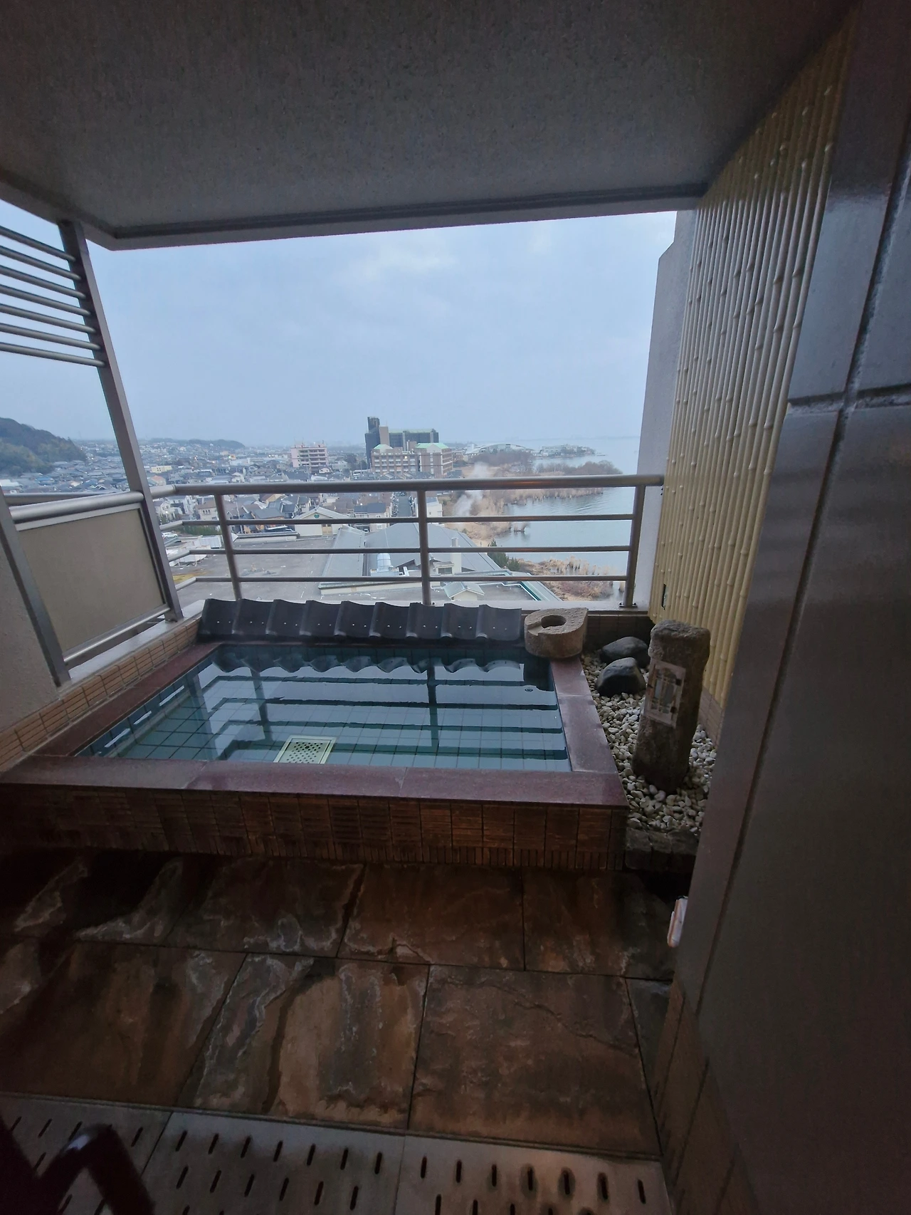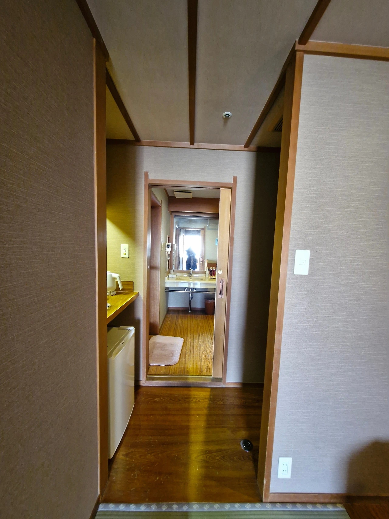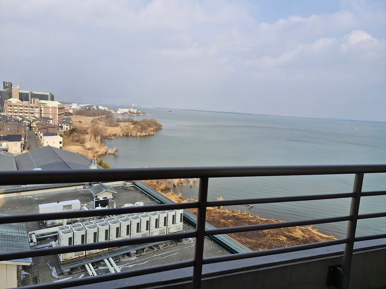 커다란 앉은뱅이 탁자가 있었고 물수건과 다과가 차려져 있었다. 커피포트와 다기 세트, 녹차도 준비되어 있었다. 다다미로 된 방엔 문을 닫으면 두 개의 방이 되도록 설계되어 있었다. 다른 방에는 탁자 밑이 파여있어 발을 넣을 수 있었다. 욕실 안에 욕조가 있고 밖에 일인용 온천탕이 구비되어 있었다. 두 개의 창이 있어 비와호가 내다보였다. 강가에는 많은 철새들이 쉬고 있었다. 강이 하도 커서 바다처럼 보였다. 비와호는 서울 면적보다 70㎢ 더 넓다고 한다. 우리나라에서 가장 큰 호수 수풍호의 2배라고 하니 어마어마했다.