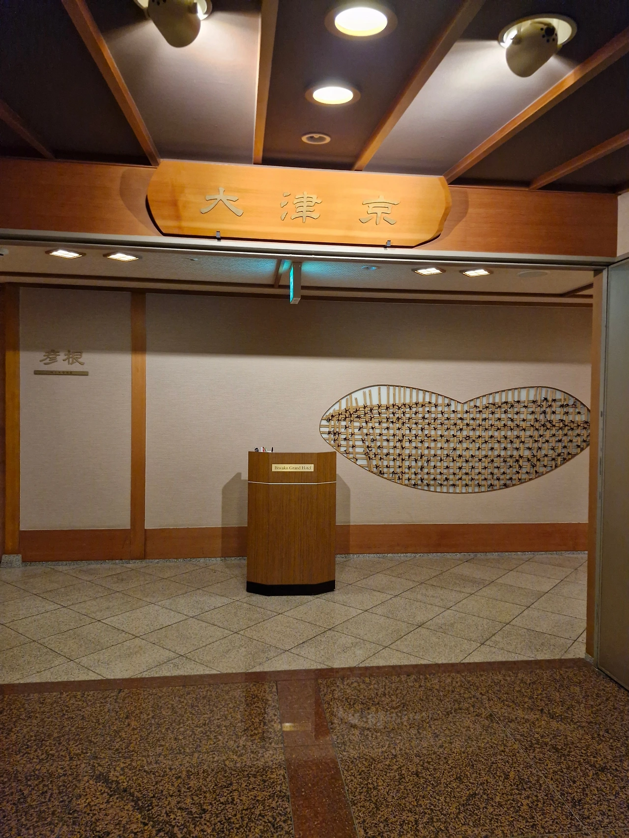 도고온센역에 내려 비와코 그랜드호텔로 연락했더니 금방 셔틀버스가 왔다 운전사가 매우 친절했다. 버스로 5분이 채 안 걸리는 거리에 호텔이 있었다. 우리는 스위트룸을 예약했는데 캐리어를 수레에 실어 8층 VIP 홍엽(紅葉)이라고 쓰여있는 방까지 갖다주었다. 방안에 가방을 내려주고 옷장에서 유카타와 양말을 꺼내주었다. 슬리퍼 있는 곳을 설명해 준 뒤 직원은 내려갔다.