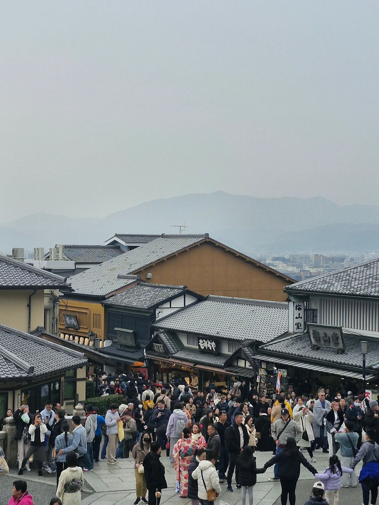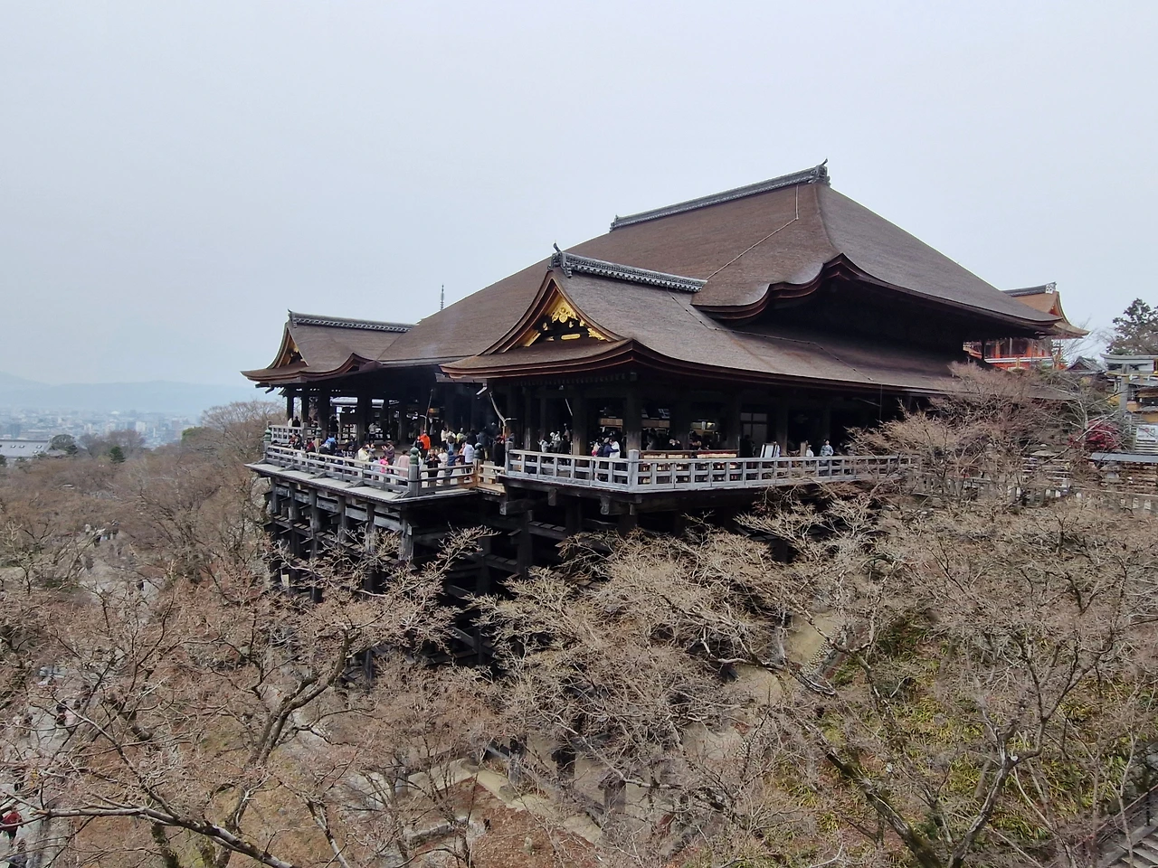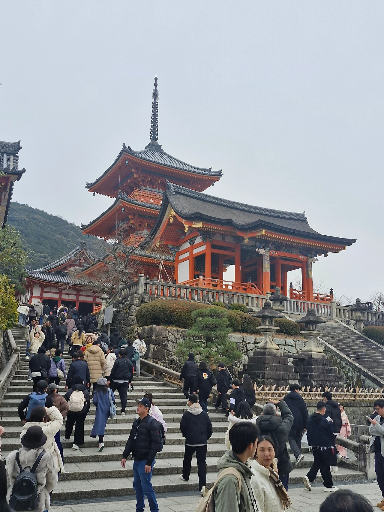 청수사까지 거리가 멀어 오랫동안 걸어야 했다. 아이들도 나도 일본어가 서툴러서 버스를 어떻게 타는지 어디서 내려야 하는지 몰랐다. 전철은 너무 복잡했다. 한 정거장 정도의 거리라서 걸어가기로 했다. 청수사 입구에 도착하자 인파로 길이 가득 밀렸다. 사람이 많을 줄 알았지만 이 정도로 많을 거라 생각 못 했다. 거의 만원 버스 수준이었다. 내려가는 사람 올라가는 사람들이 섞여 있고 기모노를 입고 화려하게 화장한 사람들도 많이 보였다. 주변에 기모노를 빌려주는 가게도 많이 있었다. 게다를 신고 오르는 사람들도 있었는데 발이 아플 것 같았다. 절은 웅장했고 건물은 회색 기와에 황금색과 붉은색의 단청이 화려했다. 절에 운세 뽑기가 있어서 다 같이 해 보았다. 육각형의 통을 흔들어 나오는 번호를 보여주면 번호에 맞는 운세를 준다. 남편과 작은 딸은 대길(大吉), 길(吉)이 나왔고 나와 큰딸은 흉(凶)이 나왔다. 흉이 나오면 길게 접어서 절에 비치된 철봉에 묶어 놓고 오면 나쁜 기운이 따라오지 않는다고 했다. 절이 높은 곳에 있어 교토 시내가 멀리까지 보였다. 인파에 밀려 우리는 올라갔던 곳과 다른 길로 내려왔다.