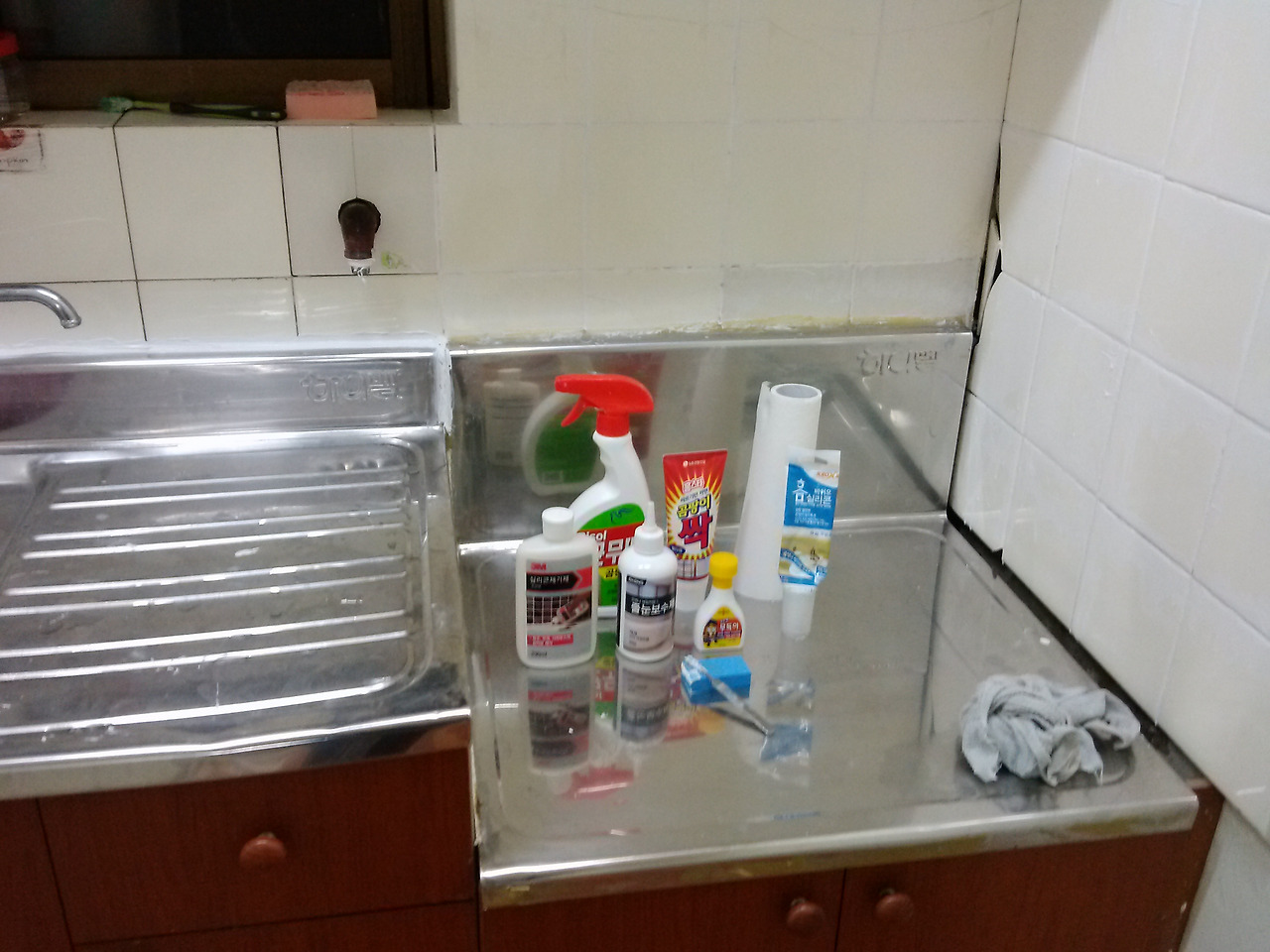 싱크대 상판과 벽을 세제로 먼저 박박 닦고, 나머지는 초강력 젯소 페인팅.