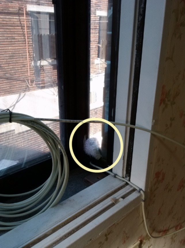 창에 난 구멍을 외로이 막고 있는 뽁뽁이 뭉치와 어지러운 케이블 선