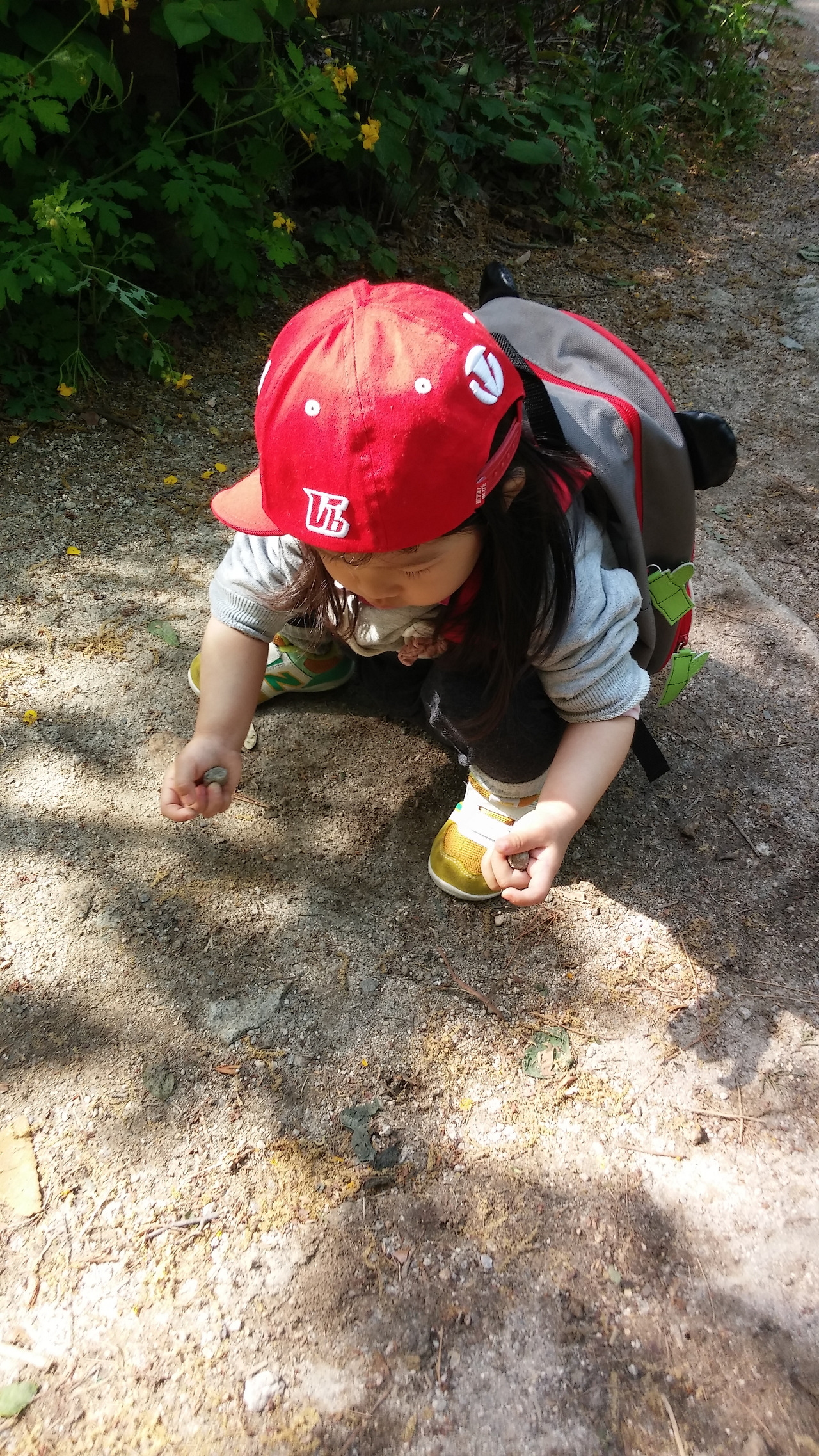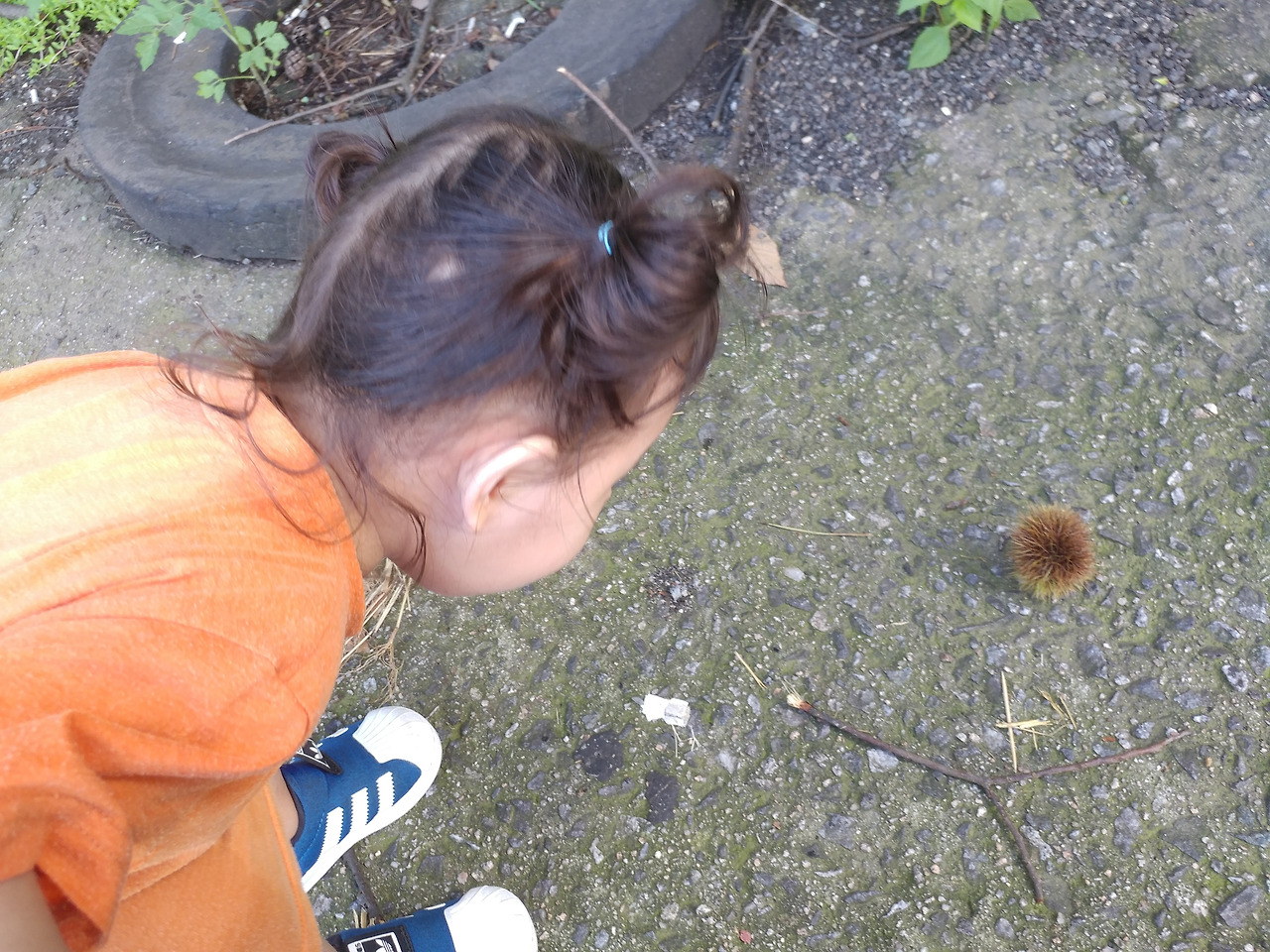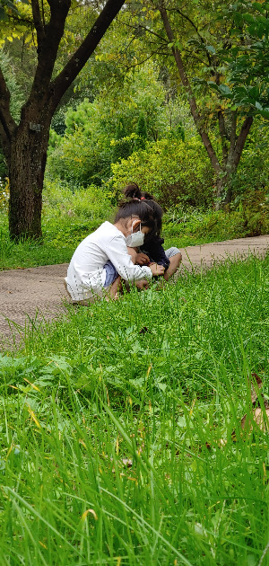 그러다가 새로운 아이템을 발견하면! 둘이 머리를 맞대고 신기해하며 함께 주위를 뒤적여 더 찾아냈다. 땅에 떨어진 예쁜 꽃잎, 도토리 모자, 밤송이 같은 것들.뱀도 본 적이 있다.