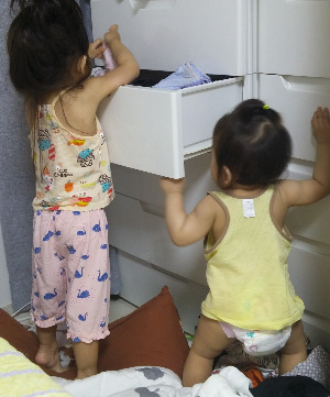 첫째는 분유를 둘째는 이유식을 준비해야 했고, 둘째가 무방비 상태로 누워 있을 때 첫째가 아장아장 걸으며 누운 아기에게로 위태롭게 다가갔다. 첫째가 번개처럼 새로운 물건을 수집해 바닥에 확 뿌리면 기어 다니던 둘째가 냉큼 집어 입으로 가져가 꿀꺽 삼켜버렸다. 조용하게 내적으로 캑캑거리고 있는 아이를 조금만 늦게 발견했으면 어쨌을까 하는 순간도 있었다. 잠들고 깨는 시간도 달라서 얼마간은 그야말로 24시간을 초긴장 상태로 있어야 했다.