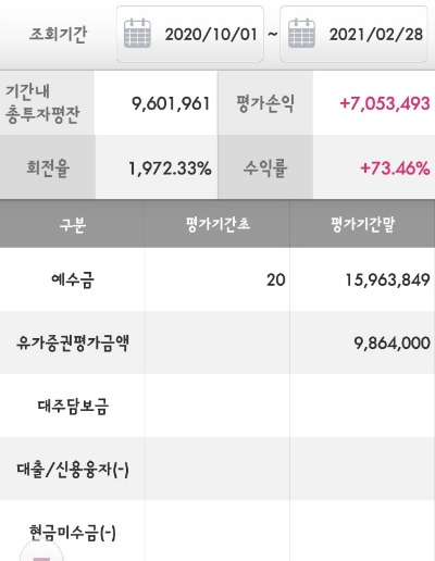 나의 수명을 위해 그때의 세세한 기억을 다 지웠지만... 몇 장 남아있는 사진을 보니 이틀 만에 급하게 돈을 더 뽑는 저 때의 조급했던 마음이 느껴지는 것 같다. 드라마에서처럼 내 눈도 시뻘겋게 충혈되어 있었을까? 문제는 결과가 좋았다는 데에 있다. 네 달을 종합하니 수익률이 70%였다. 상승장이라 해도 주위 사람들보다 잘하는 것 같았다. 초심자의 행운이 겁을 잃게 만들었다.
