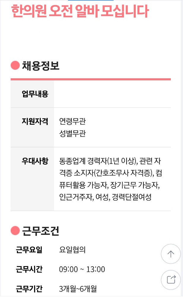 교육청 구직란을 꾸준히 체크하는 동시에 첫 번째로 뒤적였던 알바O 사이트에는 오전 파트타임 아르바이트라고는 콜센터와 금융업, 물류 아르바이트 일색이어서, 오전은 일자리가 없는 줄로 알고 포기할 뻔했다. 하지만 다른 알바OO 사이트에는 오전 파트타임 아르바이트가 꽤 있었다. 게다가 오전 9시에서 오후 1시~3시 정도 시간대 일을 한 번 열람하고 나면 아래쪽에 비슷한 시간대 일들이 주욱 나열 되었다. 아주 유용했다.