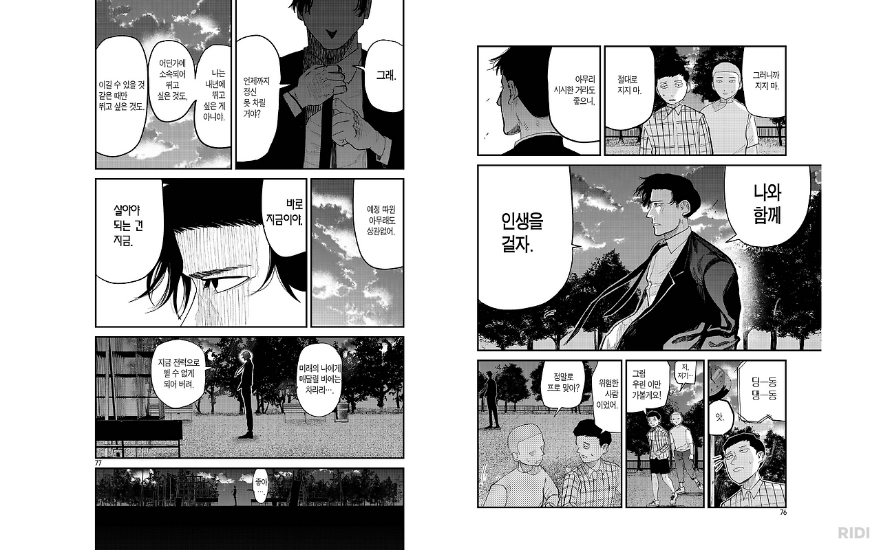 발이 부러져도, 무릎이 파열돼도 왜 그렇게까지 뛰려는 거야? 도대체 무엇을 위해 뛰는 거야? 이야기는 마침내 그러한 질문이 모두 여과되어 투명해지는 순간에 도착한다. 만화의 마지막, 두 사람의 표정은 말하고 있다. 모든 질문은 무의미해. 달리고 있는 순간만큼은. 끔찍한 고통과 순수한 몰입이 뒤섞인 채, 두 사람은 여전히 달리고 있다. 전력을 다해서. 진심을 다해서. 고정된 만화의 그림은 바로 이러한 순간을 붙박기 위해 존재한다는 듯이, 우오토는 토가시와 코미야의 아름다운 찰나를 포착한다.