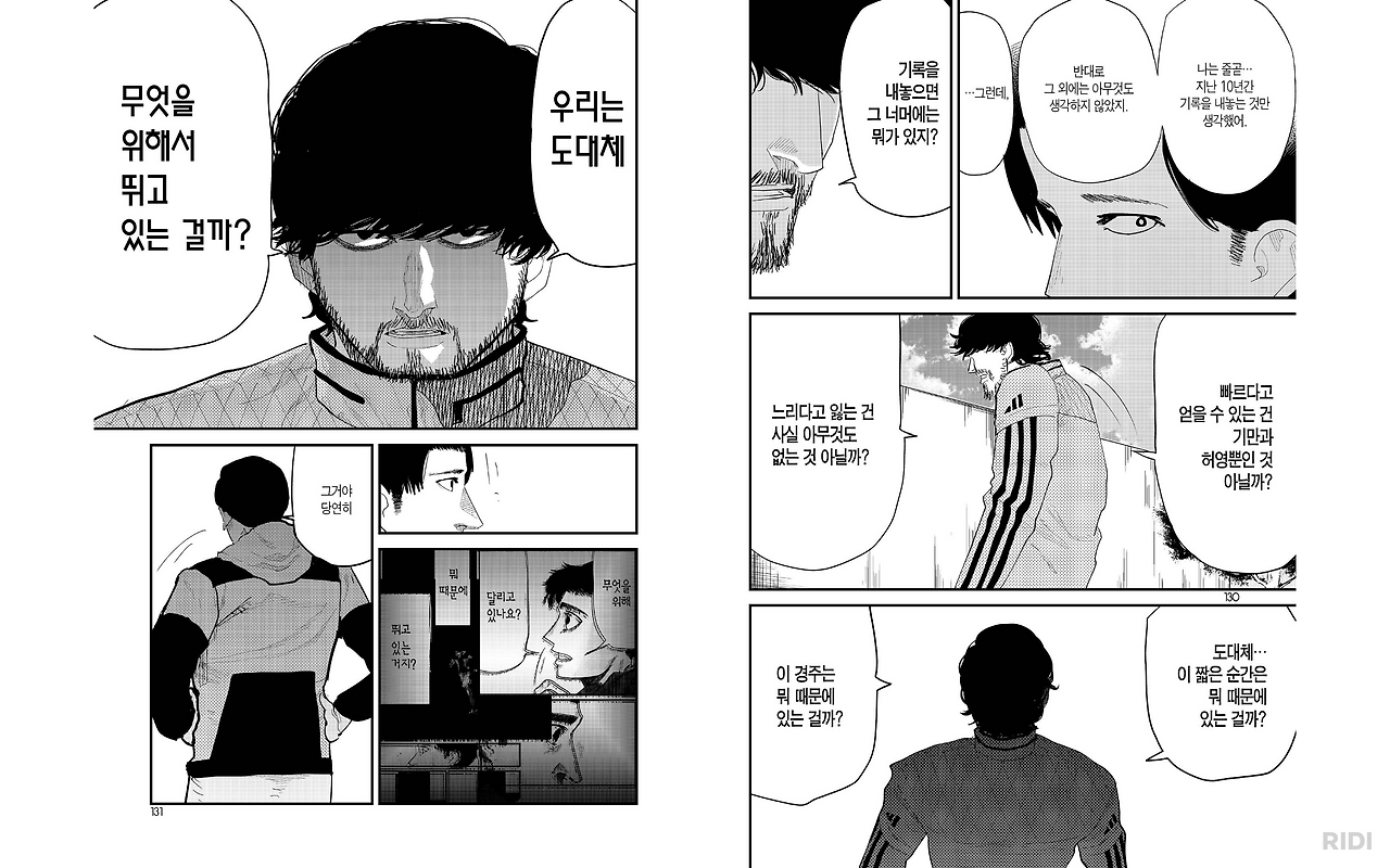 라인에 섰을 때 보이는 풍경은 일직선의 길이다. 그곳은 자신과 싸우는 자리일까, 아니면 옆에 선 경쟁자와 맞서는 자리일까. 혹은 멀리서 자신을 응원해 주는 누군가를 향해 뛰는 것일까. 일본 육상 대회 남자 100m 결승을 앞두고 코미야가 토가시에게 던진 질문은, 만화가 우리에게 하는 질문이기도 하다. "우리는 도대체 무엇을 위해 뛰고 있는 걸까?"