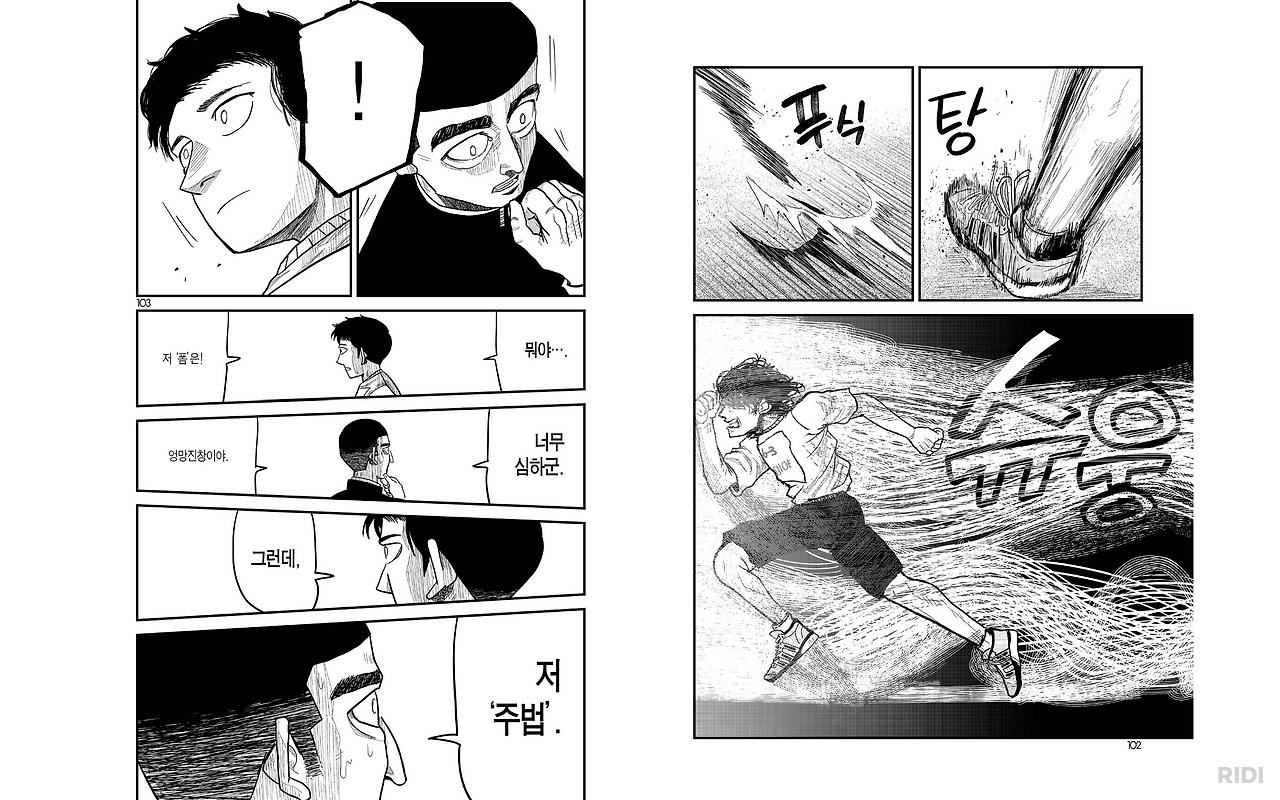 토가시는 아사쿠사의 부탁으로 마지막으로 100m를 뛰기로 한다. 하지만 아무런 기대 없이 달린 자리에서 그는 뜻밖의 감각을 체험한다. 토가시는 아사쿠사를 떠올리며 달리기 시작한다. 그리고 이어지는 장면. 만화 전체를 통틀어 가장 순수한 직관의 페이지가 이곳에 있다. 두 펼침면을 가득 채운 토가시의 달리기에는 집착도, 광기도 없다. 만화의 네모난 칸을 뚫어버리겠다는 기세도 존재하지 않는다. 그는 그저 박차고 나가는 중이다. 윤곽선마저 사라진 공간 속에는, 토가시가 그 순간을 온전히 누리고 있다는 평온만이 깃든다. 그는 두 번째로 '전력질주를 하고 있다'고 느낀다. 그리고 자문한다. "왜 방금 전력을 다해 뛴 거지? 나는 왜 방금 빨랐던 거지?" 아마도 이 문장의 '왜'는 '어떻게'로 바꿔 적어야 할 것이다.