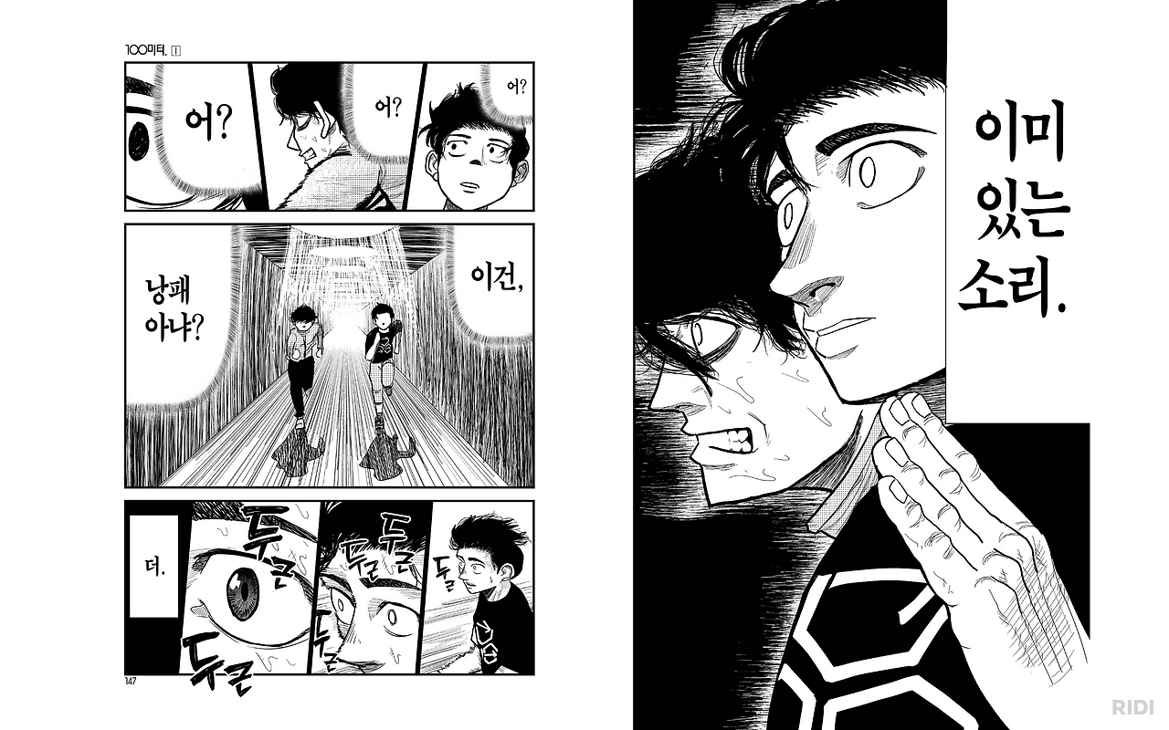『100m.』는 '전력질주'의 만화다. 동시에 전력질주 하는 만화이기도 하다. 전체 내용 중 '전력질주'라는 표현은 단 두 차례 등장하는데, 그것이 이 작품을 이해하는 가장 중요한 장면이다. 다시 만화를 보며 이 표현을 곱씹었다. 전력질주. 말 그대로 온 힘을 다해 빠르게 달려 나간다는 뜻. 익숙한 단어임에도 불구하고 나는 그 말이 너무나도 생경했다. 도대체 전력질주라는 건 뭐지? 나는 전력질주를 해본 적이 있나? 아마도 내가 처음이자 마지막으로 온 힘을 다했던 때는 엄마의 몸을 가르며 나왔던 탄생의 과정에 있었을 것이다. 스스로 육체를 통제하지 못하고 이미 그것을 앞질러 버렸을 전력의 순간.