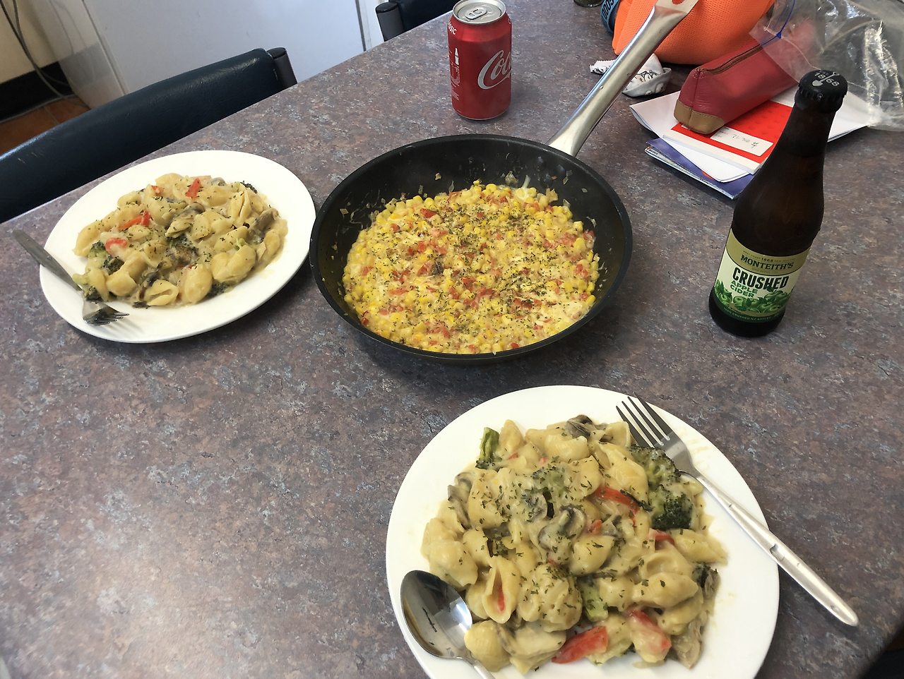 그리고 먹은 저녁. 꿀맛 중의 꿀맛! 신랑 표 파스타와 치즈콘. 그리고 몬티스 사이다와 콜라. 온천 즐기고 집에 와서 밥 먹는 기분이었다.