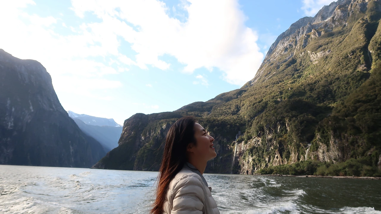 우리는 아침 8시 50분 크루즈를 타기로 되어 있었다. 전 날 준비한 샌드위치를 먹으면서 승선을 기다렸다. 크루즈 안에 비치되어 있는 티와 뜨거운 물, 우유를 함께 즐길 수 있었다. 확실히 유명한 관광지를 가면 뉴질랜드에 여행객이 많이 없다는 걸 느낀다. 우리가 탄 크루즈에는 우리 넷을 포함해서 승객이 10명도 안 되었다. 그 덕분에 우리는 뷰 맛집 배 앞자리에 사이좋게 앉아 펼쳐진 풍경을 넋 놓고 바라볼 수 있었다. 정말 '멍 때리며' 바라본 밀포드 사운드. 여행을 처음 시작할 때와 약간의 달라진 점이 있다면 좀 더 열심히 사진을 찍고 있는 나와, 좀 더 열심히 멍 때리는 오빠의 모습이다. 덕분에 사진의 구도가 맞춰지듯 우리의 여행하는 방식이 조금씩 균형을 이루고 있다. 밀포드 사운드는 말 그대로 너무나 아름다웠다. 퀸스타운 DOC에서 만난 직원 분은 크루즈 대신 카약을 추천해 주셨었는데, 카약을 두 번 경험해 본 대만 친구는 너무 힘들어서 두 번 다시 하고 싶지 않다고 했다. 아마도 그 직원 분은 평범한 것을 거부하는 모험을 즐기시는 분 같다. ㅎㅎ 나도 은근 내면 깊은 곳에 모험심이 꿈틀거리고 있어서인지 카약을 타고 야생의 밀포드를 즐겨보고 싶었지만 가격도 크루즈에 비해 3배여서 과감히 내려놓았다. 날 것의 밀포드 사운드를 경험하러 다음에는 걸으러 오고 싶다. 참고로 트래킹을 하며 머무를 헛(산장)은 최소 6개월에서 1년 전에 예약해야 된다고 한다.