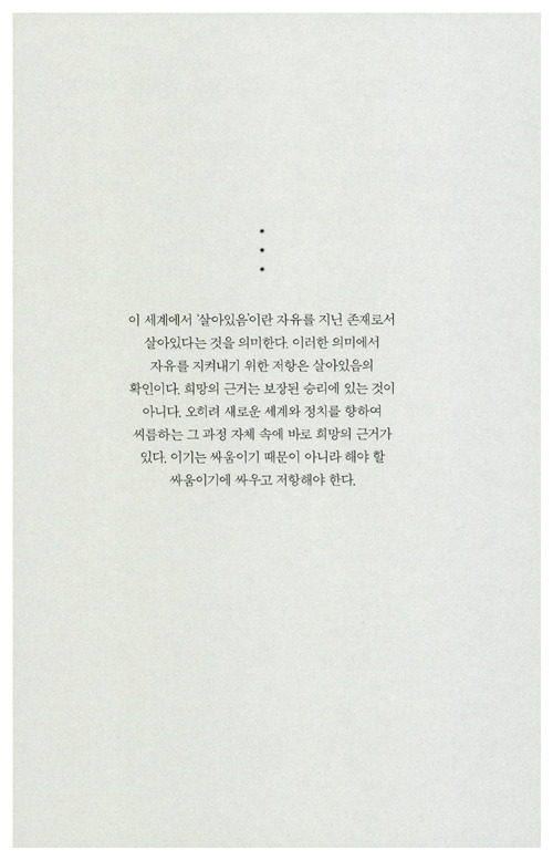 나는 이 책의 독자들이 각각의 시선과 열정을 가지고 큰 대로를 경험하는가 하면, 작은 골목도 경험하기를 바란다. 그래서 자신의 세계만큼, 자신이 지닌 시선과 질문들을 따라가며 이 책에서 자신의 사유세계와 삶을 풍성하게 만들 수 있는 그 어떤 것을 만나게 되기를 바란다. 그리고 그 '만남'을 통해서 인간이라는 존재가 결국 '함께-존재'임을 인식하고, 자신과 타자를 보는 시선이 무관심과 냉담함에서 따스함으로 조금씩이라도 바뀌게 되기를 바란다.