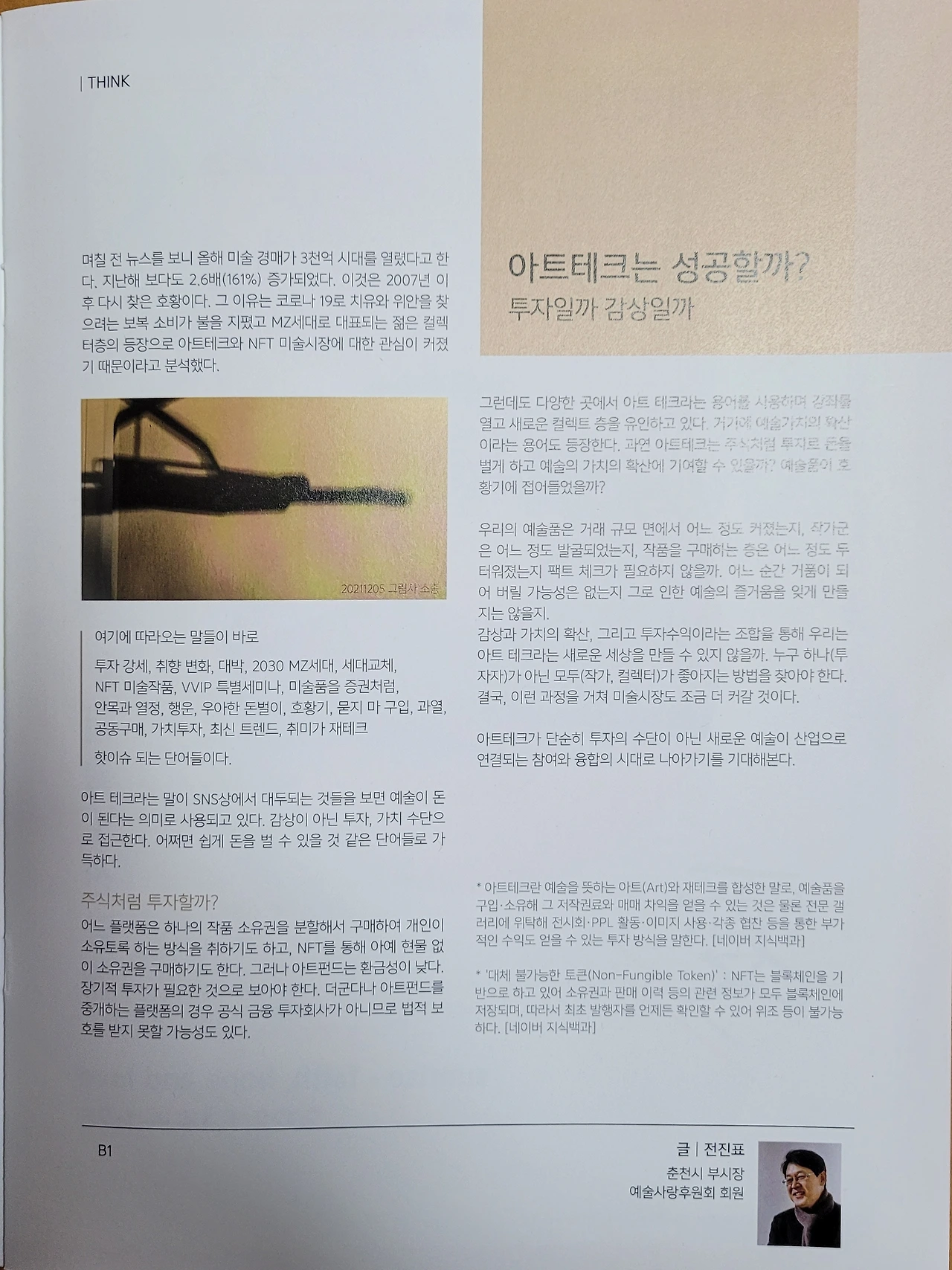아트테크가 단순히 투자의 수단이 아닌 새로운 예술이 산업으로 연결되는 참여와 융합의 시대로 나아가기를 기대해본다.