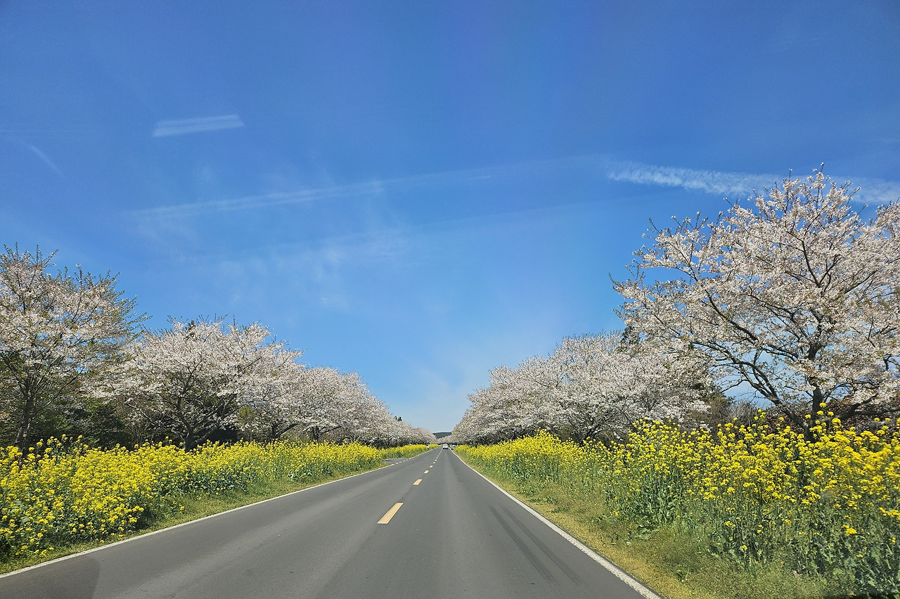 일기예보에 내일 비가 내린다 하여 꽃구경을 놓칠까 오늘은 꽃길을 찾아 나서기로했다. 아침에 먼저 해안을 따라 5번 올레길을 일부분 걸었다. 많은 사람들이 올레길을 걷고있었다. 바다를 보는 시야가 시원하게 펼쳐진 구간이다. 그리고 도로를 따라 벚나무와 유채꽃이 활짝 핀 '녹산로'와 휴애리, 쇠소깍 둘레길을 걸었다. 평일이라 그런지 차량이 많지 않아 여유롭게 다니고 거닐 수 있어 좋았다.