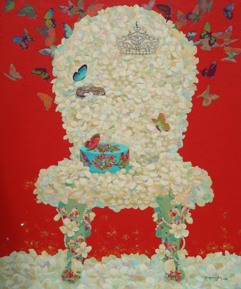 색감이 그렇고 대상이 된 사물들이 그렇다. 연분홍빛 색감의 꽃에 진주가 꽃술로 놓여 있다. 꽃의 형상이 보석으로 빛난다. 분첩이 주인공인지 꽃이 주인공인지 진주가 주인공인지 나비가 주인공인지 혼란스러울 뻔 한데 가지런히 의자 위에 올려진 분첩은 그 역할을 다한다.