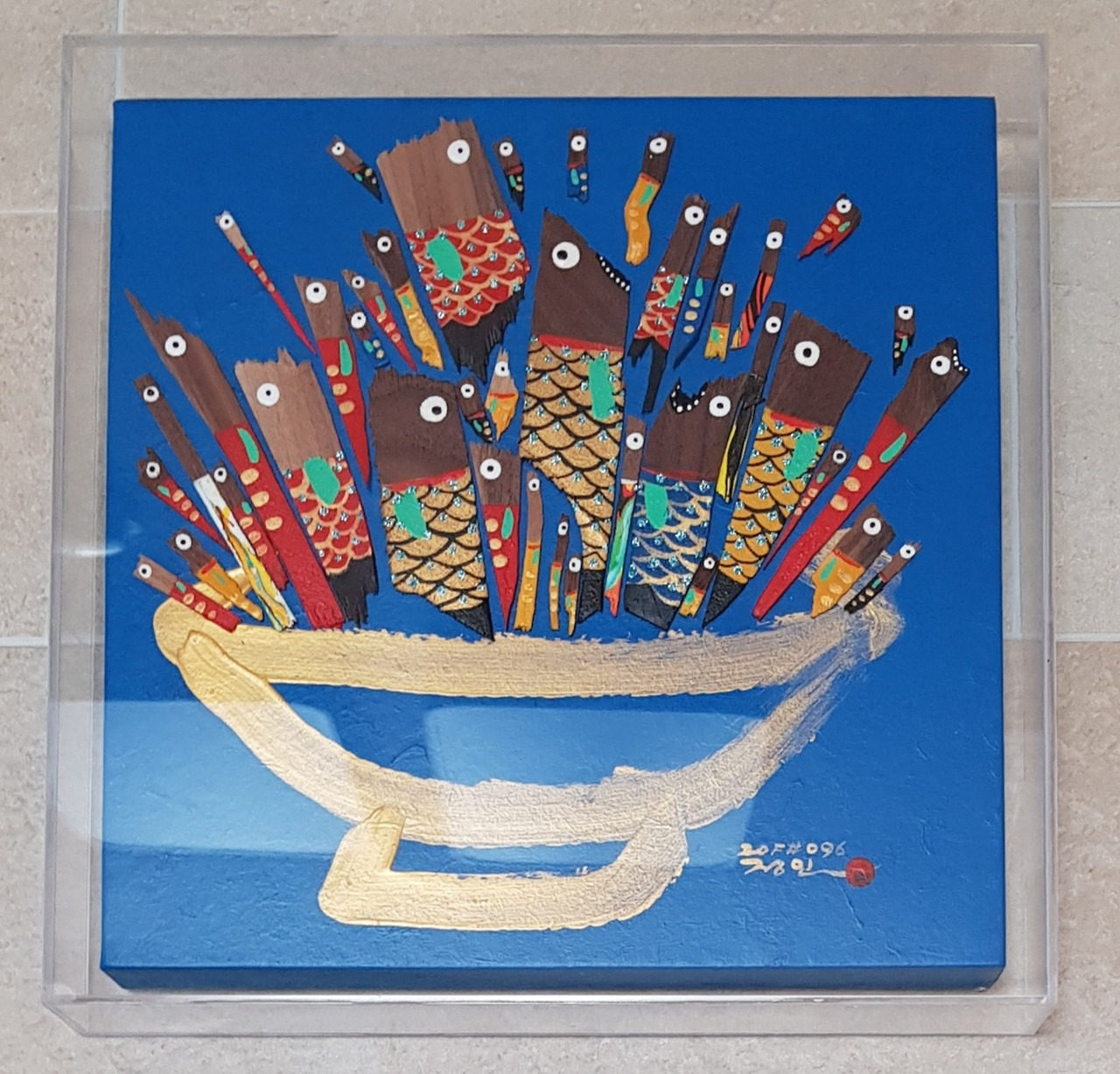 작가의 작품은 부조인 듯 평면회화이다. 합판에 한지를 입히고 그 위에 물감으로 배경을 만든 다음 작은 물고기 하나하나를 그 면 위에 올린다. 면은 곧 점이 되고 선이 되어 물고기를 만들고 무리를 만든다. 그 거대한 무리는 한 공간을 완벽하게 장악하는 것이다.