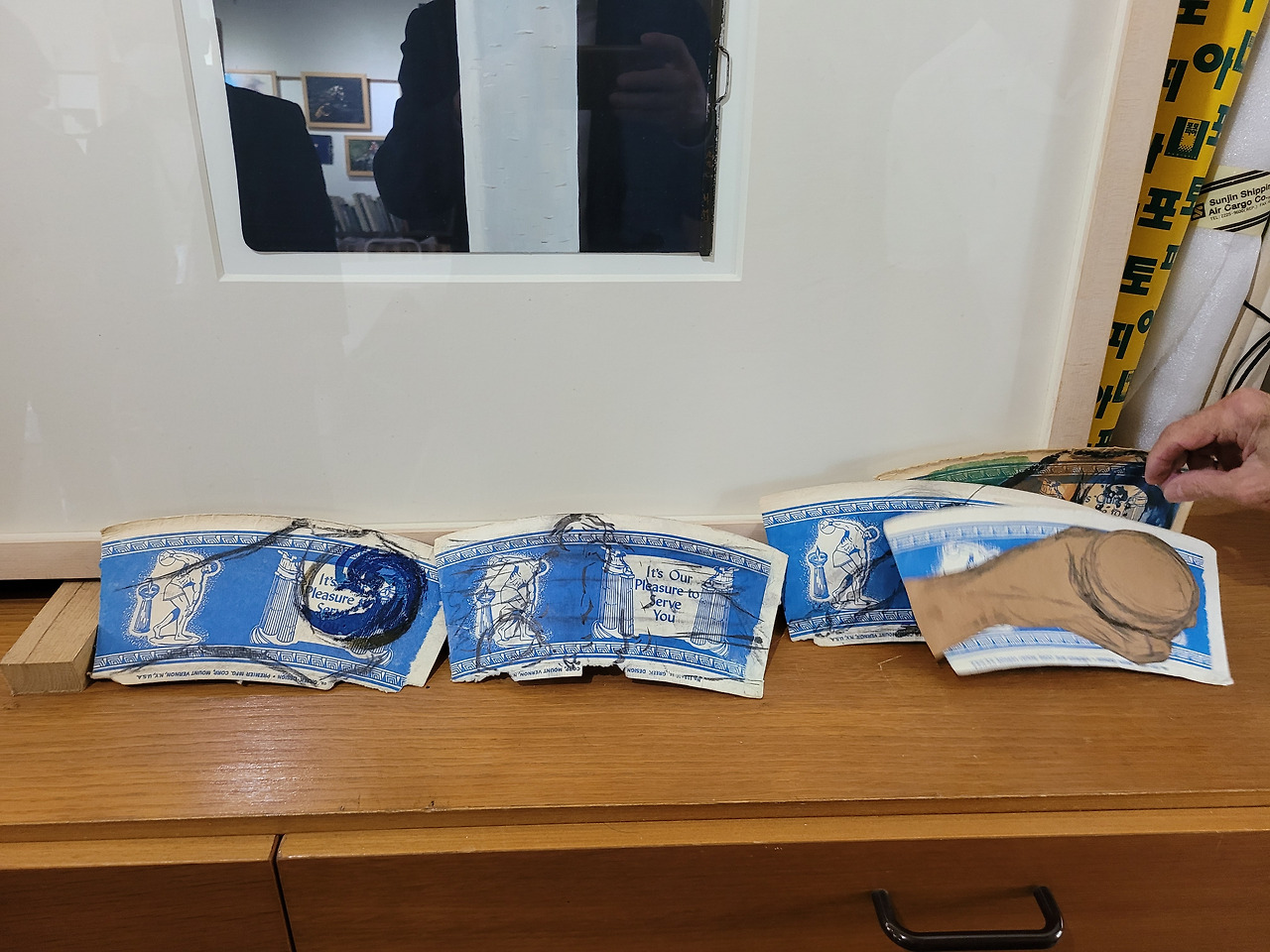 또 하나 재미있는 작품은 그들 생각과 이민자로서 미국 땅에서 억압받는 이민족들 입장을 표현하기 위해 문장을 바꾸어 다른 뜻으로 해석한 작품입니다. 미국 생활 중 자주 가던 커피숍의 종이컵에는 로마 신화시대 그림과 글자가 인쇄되어 있었다. 거기에 쓰여 있는 문구(It's our pleasure to serve you)를 (It's our pleasure to torture you)로 바꾸어서 작품으로 만들었다고 하네요. -"당신에게 이것을 제공할 수 있어 기쁩니다"를 "우리는 당신께 고통을 줄 수 있어 기쁩니다." -