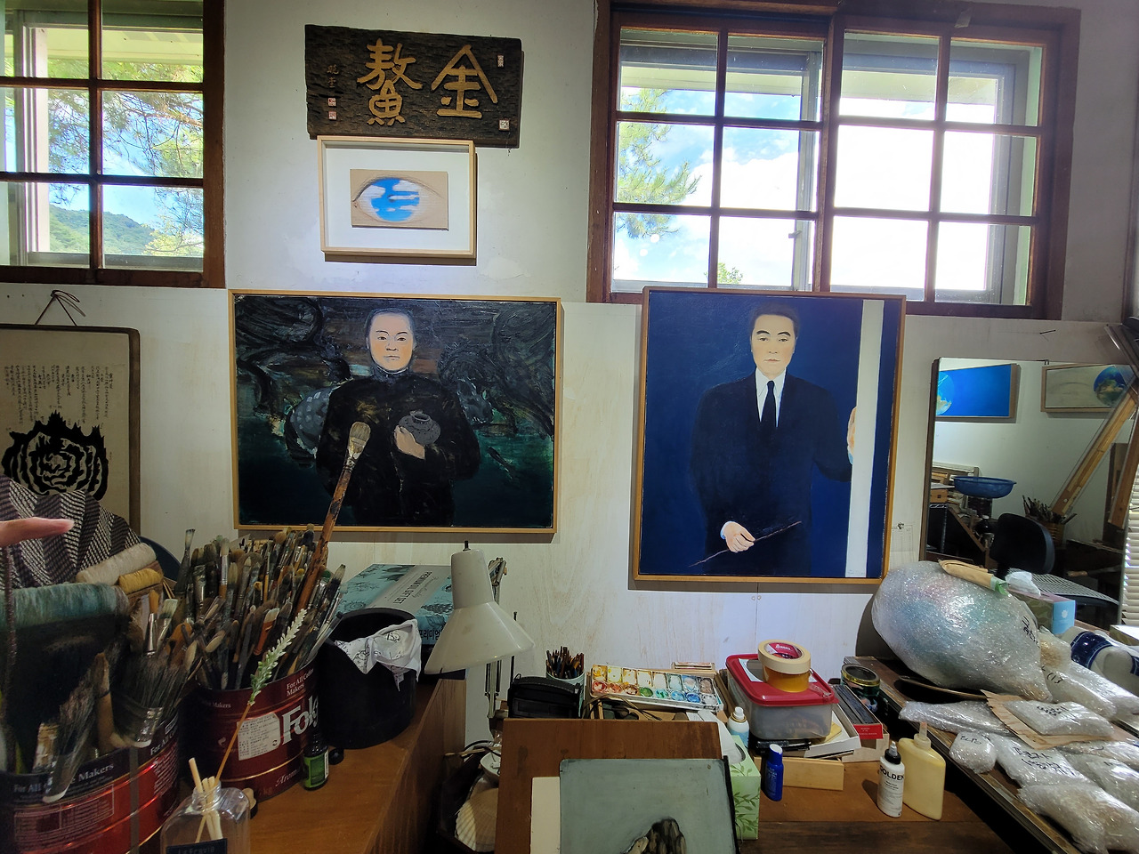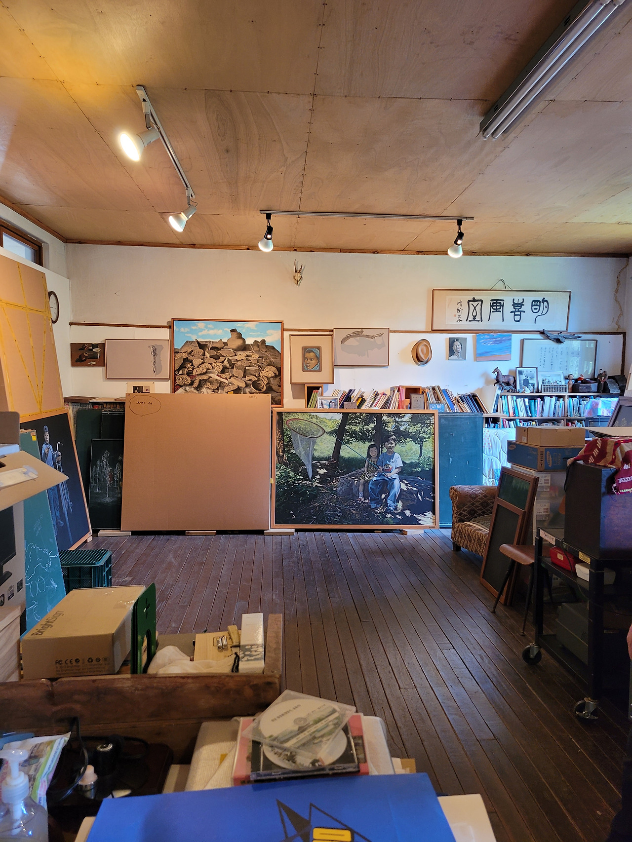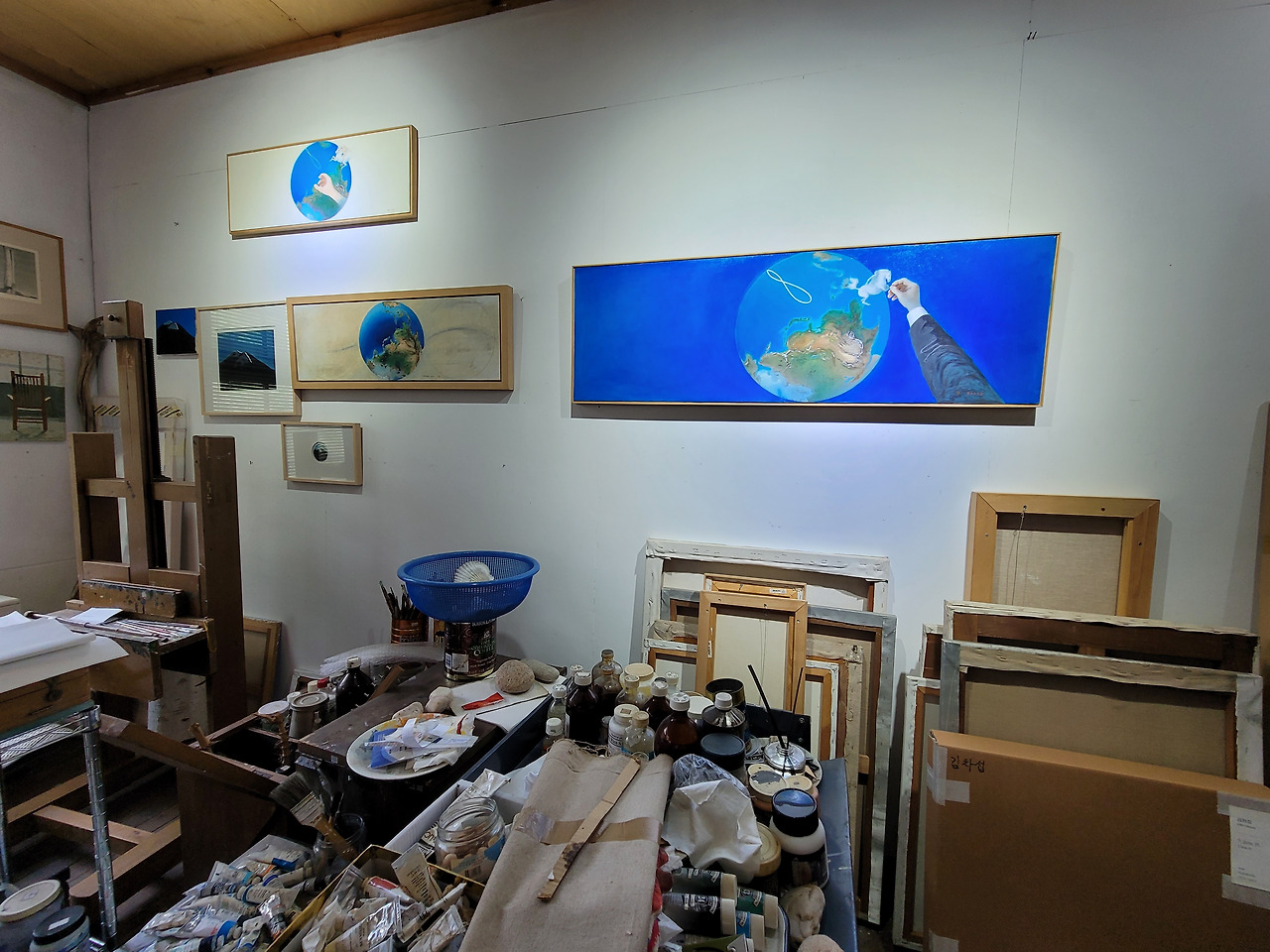 폐교 3칸 교실은 한 칸을 생활공간으로 사용하고 두 칸은 각자 작업 공간으로 활용하고 계시네요. 작업 공간에는 그간의 작품들과 현재 진행 중 작품들이 조화를 이루며 역사를 만들어 나가고 있는 현장을 보여주고 있어요. 일종의 박물관 느낌이 드는 공간 같았습니다. 가장 눈에 띄는 것은 세계지도였는데요. 거실 같은 생활공간에 벽면을 가득 채운 지도 위에 대한민국을 표시한 커다란 표시(?)가 인상적이었습니다. 세계 중심은 우리라는 깊은 의식을 보여주는 듯했습니다.
