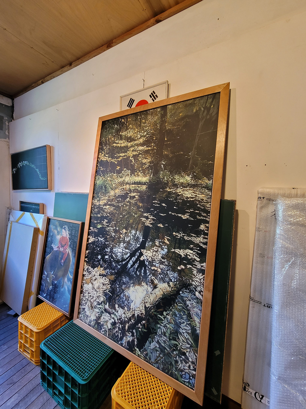 녹색의 옛 칠판 위에 작업을 하는 김 작가님은 주로 사람들 모습과 풍경을 많이 그리시는데요. 대부분 추억 가득한 작품이 마음을 심쿵하게 만듭니다. 모네 그림을 연상하게 만드는 연못 그림은 바로 작업 공간 옆에 있는 작은 연못 풍경인데요 실제 공간을 옮겨다 놓은 듯 자연의 풍성함이 느껴지는 그림입니다. 큰 나무가 연못에 비치고 바람에 부러진 나뭇가지가 연못에 담겨있는 그것은 살아있는 생명체였습니다.