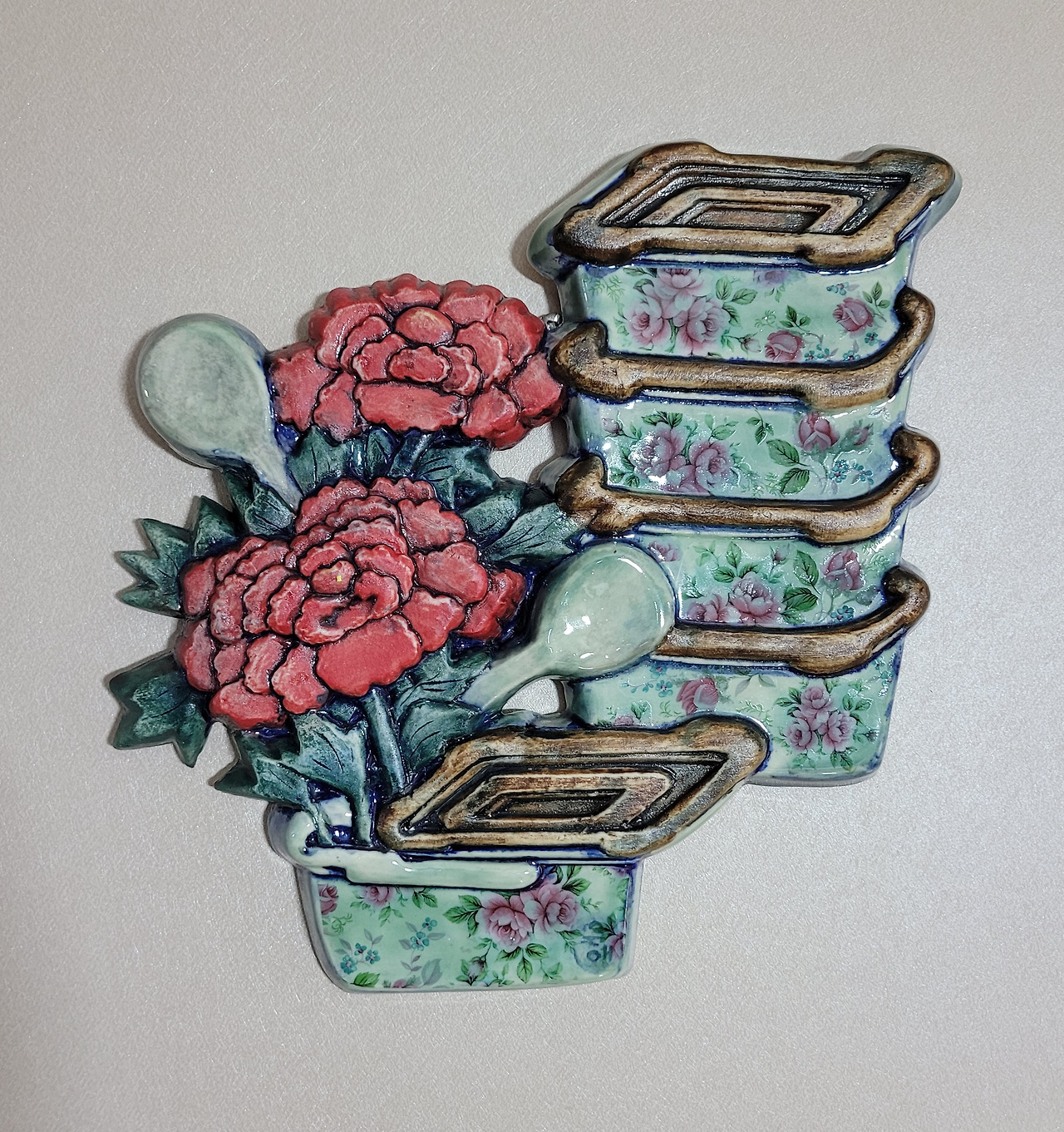 도자(조형)화는 그린다고 하기보다는 빚고 틀로 찍어낸다고 하는 것이 더 맞을 것 같다. 하나의 조형작품이다. 다양한 모형을 제작하여 붙이고 깎고 하는 과정을 거쳐서 만들어 내기에 과정이 복잡하고 시간이 많이 걸리는 작품이다. 대신 작품의 변색 걱정이 없어 전시나 보관상에 조금 편리하다 할 것이다. 도자화의 대부분은 꽃이나 서가 등 전통 민화적 이미지를 많이 지니고 있는 작품이 많다. 여기에 현대적 감각을 더 반영하여 소재가 다양하게 사용된다는 것이다. 이것 또한 표현의 한계성과 작품 이미지의 동질성을 높이기 위함이 아닌가 생각된다.