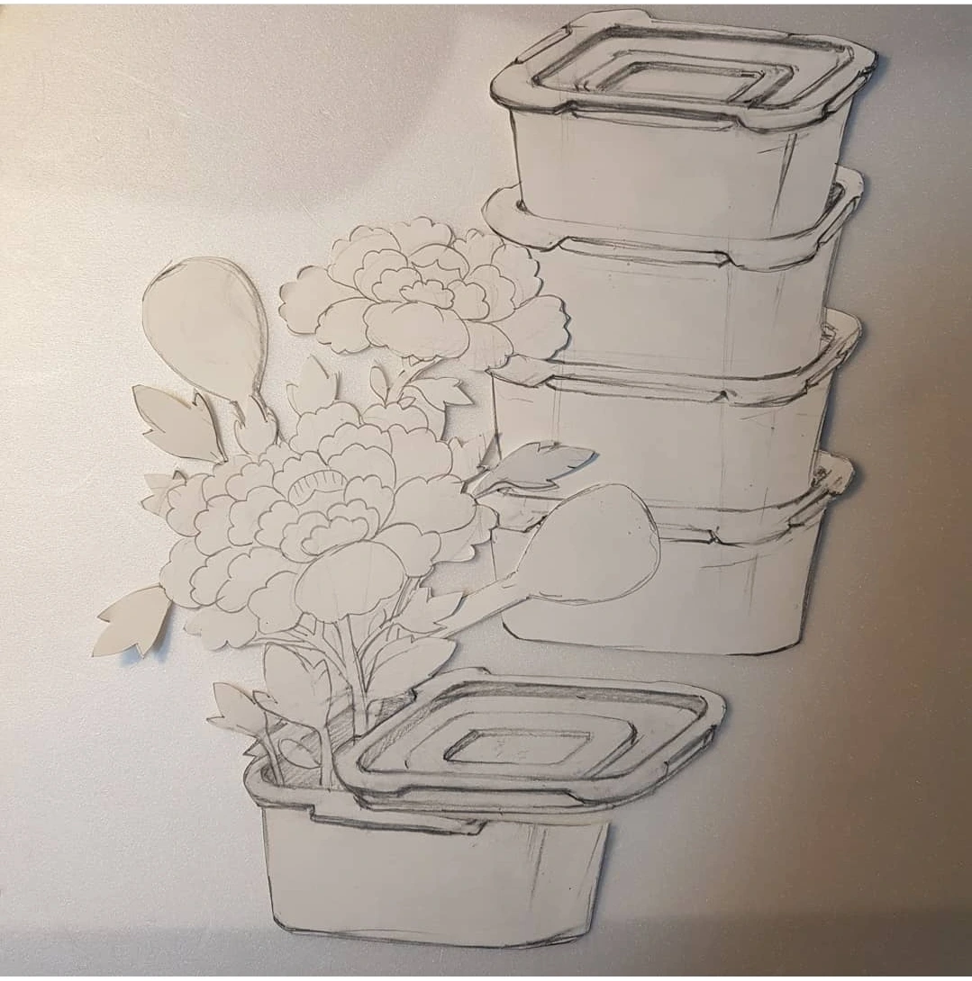 내용적인 면에서 보면 전통 민화적 요소를 띄고 있으면서 현대의 감각적인 재미를 담아냈다. 전통적 요소인 꽃, 복숭아, 집 등 상징적 소재와 일상생활 속 물건인 치약 등 다양한 소재가 등장한다. 조금 색다른 주재로 나타나는 것이 찬그릇이다. 반찬 그릇을 겹겹이 쌓아 올려 만든 작품이다. 왜 이것을 선택했을까 하는 물음에 자신의 일생에 있어서 아내, 엄마 등 가족 구성원의 삶이 작품으로도 계속 이어진다는 관점에서 찬그릇을 소재로 삼았다고 한다. 결국 우리의 삶은 끊어질 수 없는 인과관계로 엮어져 있기에 뚜렷이 갈라 낼 수 없다는 것이다. 그래서 그의 작품이 더 친근한지도 모르겠다.
