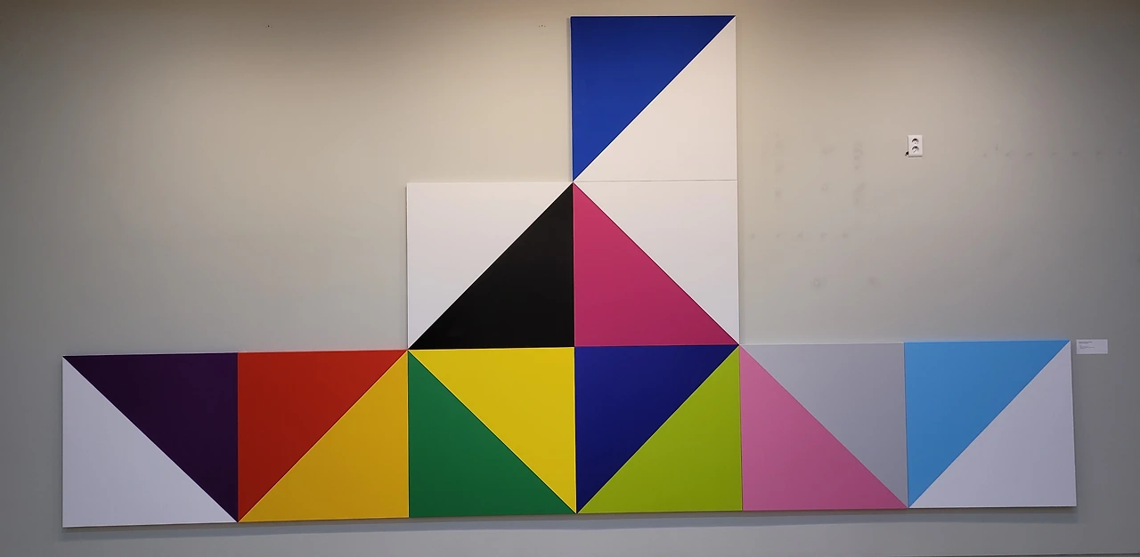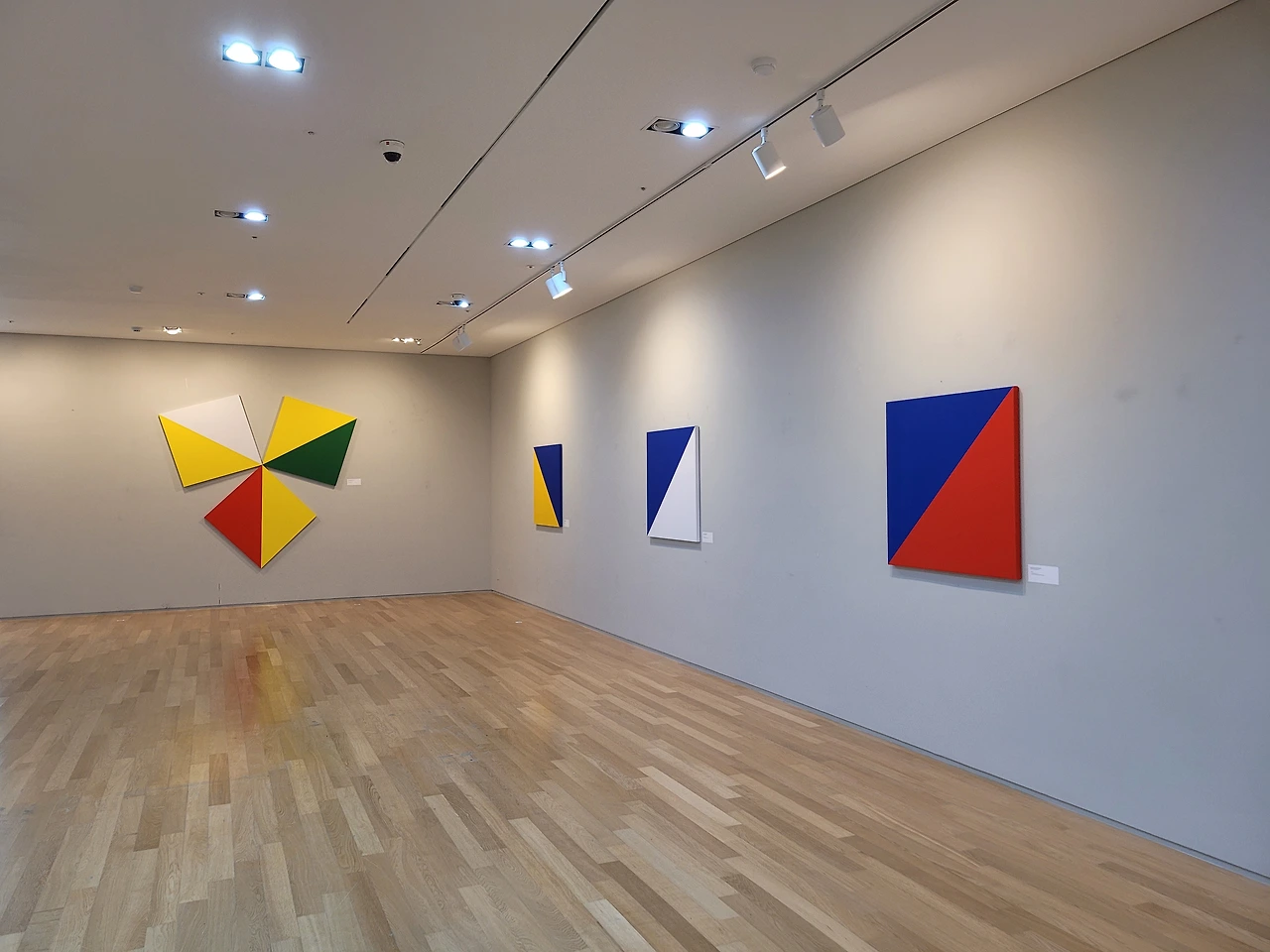 그가 그리는 삼각 도형은 구상이지만 추상이다. 구상 같은 추상이 더 어울리겠다. 삼각형이 모여 사각을 이루고 돛단배를 만들고 바람개비를 만들고 성을 알리는 깃발이 되기도 하는 다양한 메시지를 만들어 낸다. 원색으로 대비되는 삼각형이 사각을 이루며 이야기를 만든다. 각각의 삼각이 사각을 이루고 크고 작은 삼각이 모여 원을 만든다. 그 조각의 파편들은 돛단배를 만들고 호랑이와 도깨비를 만들며 상상을 자극한다. 그의 작품은 결국 많은 작가들이 이야기하는 것처럼 최종적으로는 희망의 메시지를 던진다..