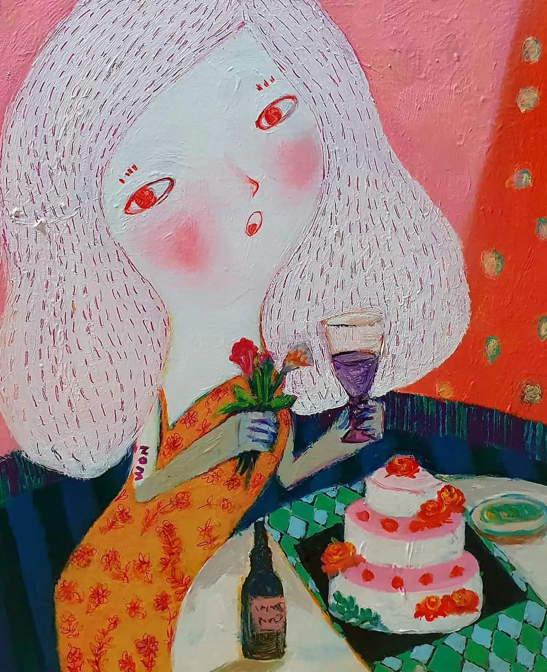 (위) 꽃을 든 여인이 혼자 와인 잔을 들고 케이크 앞에 서 있다. 완벽한 연출을 통해 분위기는 최고조를 이루었다. 한껏 차려입은 모양으로 보아 중요한 날이다. 발그레한 얼굴빛은 조금 심통해있다. 꽃무늬 원피스가 한껏 부풀어 오른 마음을 대변해 준다. 아직 촛불도 꽃지 않은 케이크로 보아 기다리는 이는 아직 오지 않았는가 보다. 아니 바람맞았는지도 모르겠다.