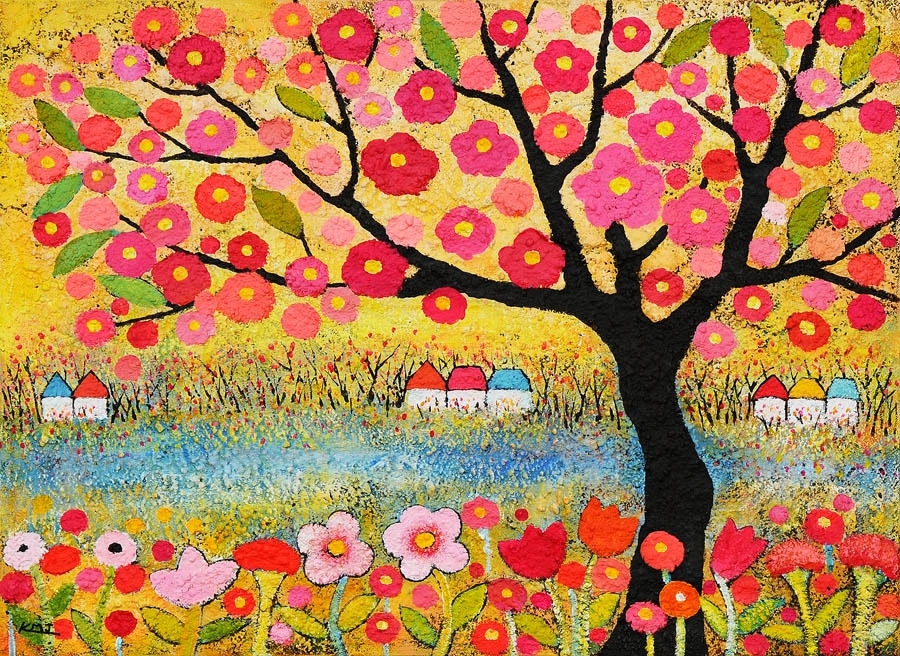 밝기만 한 그림 속에서 보는 이는 희열을 느끼게 되는지도 모른다. 산속에 집이 있고 커다라 꽃나무 아래에는 다양한 꽃들이 피어난다. 화면 가득하게 꽃을 채움으로써 마음속 고향 풍경 같은 모습으로 따뜻함을 보여준다. 삶은 아름답게 가꾸어 나가는 것이다. 꽃나무처럼 물을 주고 향기를 얻는 것이다.