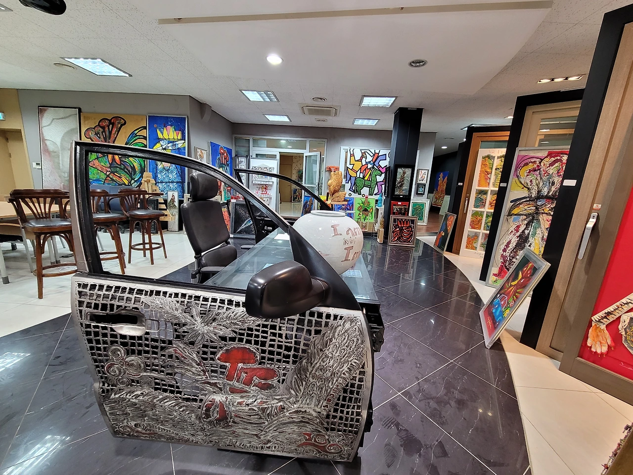 온갖 철판과 재료는 다 갖다 놓고 작업을 하는 듯, 공간 전체가 작품과 재료로 가득 차 발 디딜 틈이 없을 정도다. 자동차를 해체하여 작업을 한 결과물도 그대로 남아있고, 회사에서 나오는 문짝 등도 작업을 위해 곳곳에 놓여있다. 이런 환경에서 작업을 한다는 것 자체가 쉽지 않은 작업임을 한눈에 알게 했다. 결국 작가의 의지다.